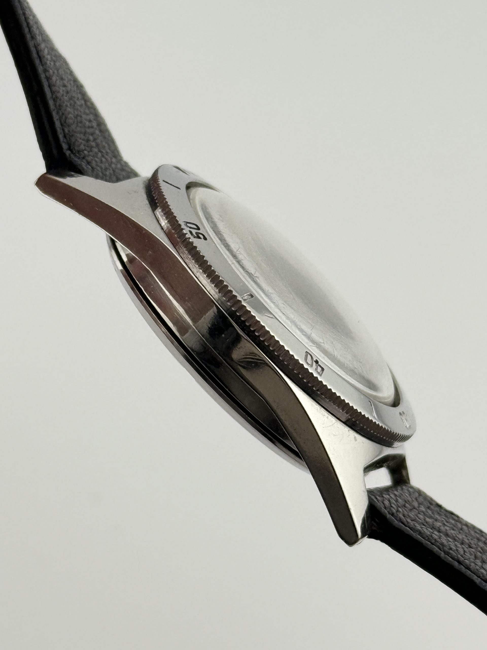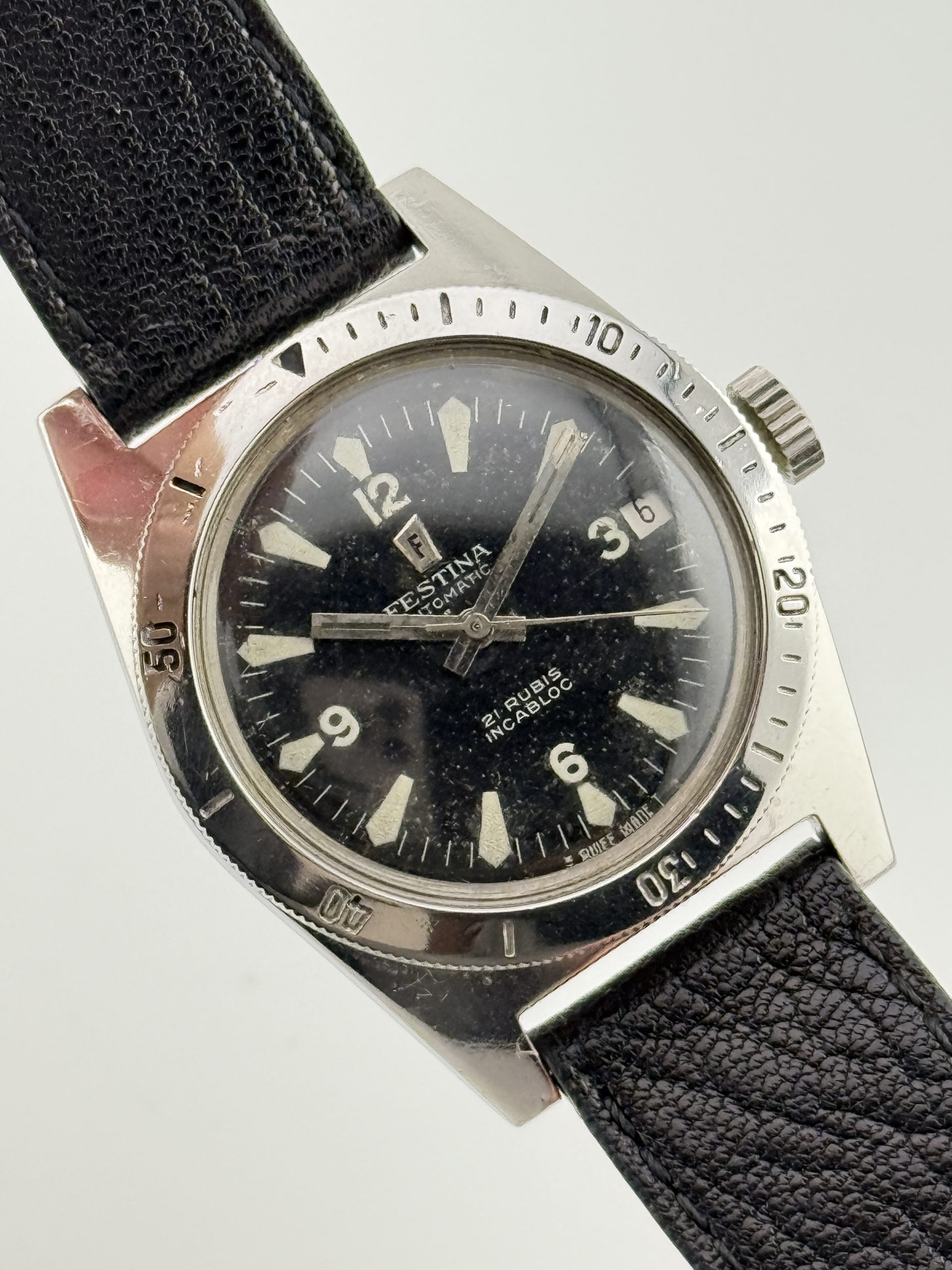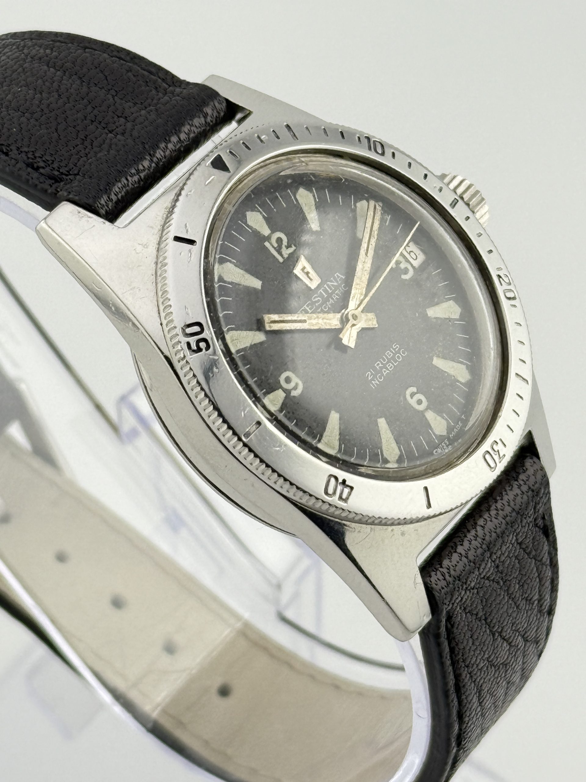 Raro Festina Skin Diver anni ’70, un orologio subacqueo che incarna lo spirito dell’esplorazione marina dell’epoca. Con una cassa in acciaio da 36 mm e una profondità dichiarata di 600 feet (18 ATM), rappresenta un segnatempo resistente e affascinante, destinato agli amanti del vintage. Il quadrante nero con indici e numeri arabi al 12-3-6-9 garantisce un’ottima leggibilità, mentre la lunetta girevole a scatti conferma la sua natura da vero diver.