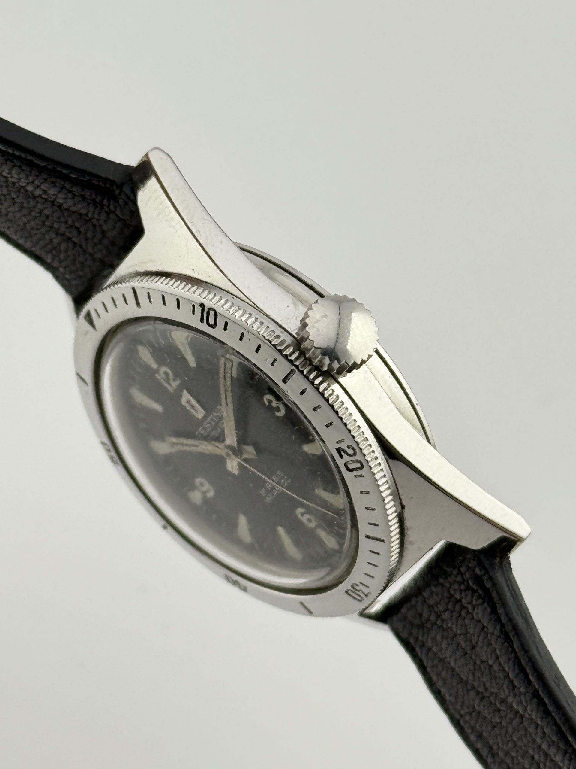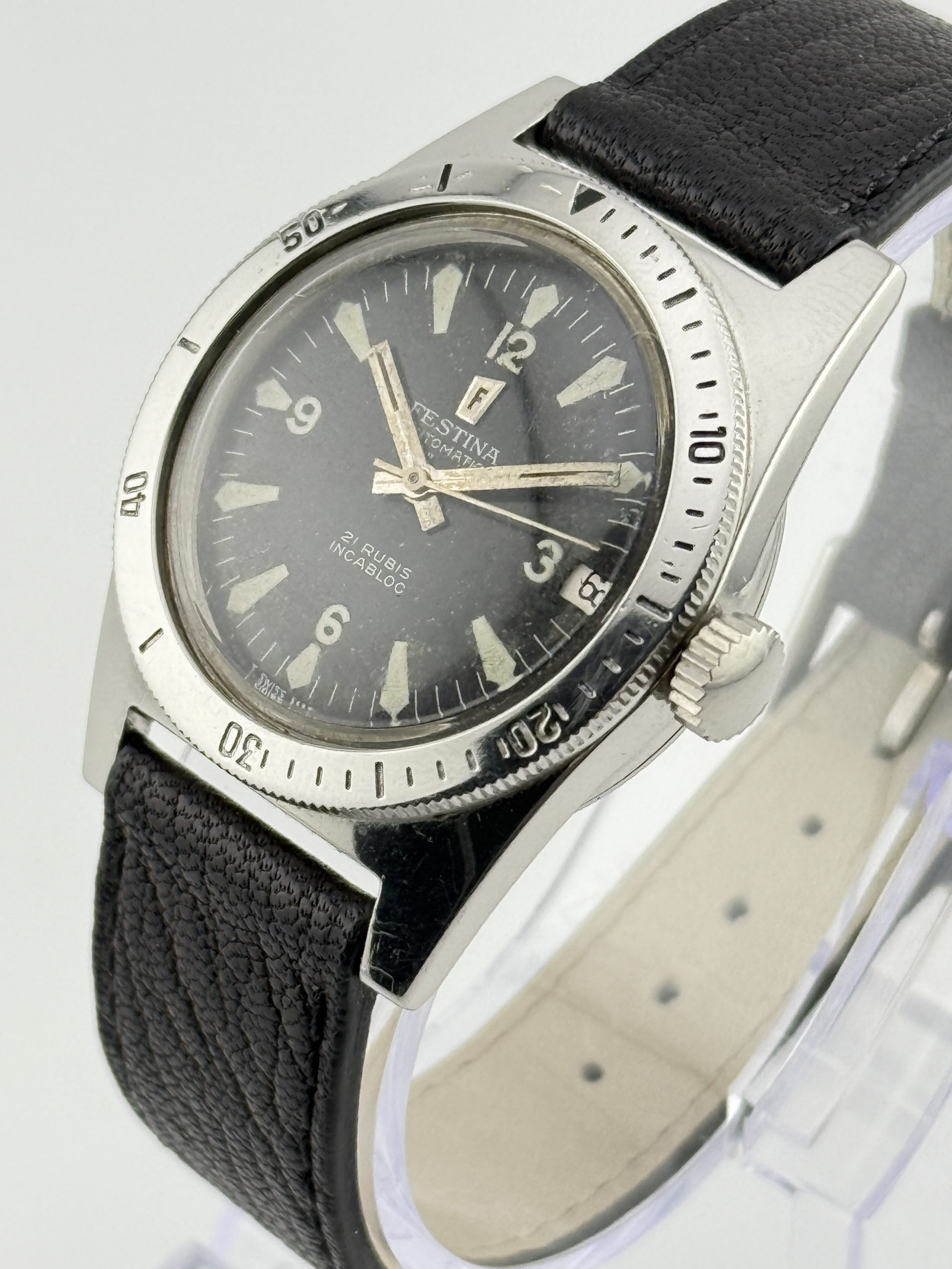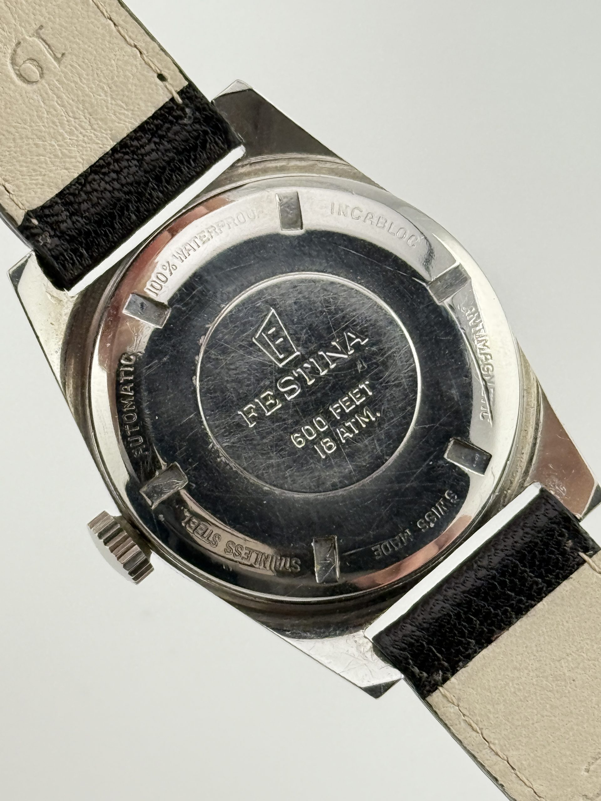 Raro Festina Skin Diver anni ’70, un orologio subacqueo che incarna lo spirito dell’esplorazione marina dell’epoca. Con una cassa in acciaio da 36 mm e una profondità dichiarata di 600 feet (18 ATM), rappresenta un segnatempo resistente e affascinante, destinato agli amanti del vintage. Il quadrante nero con indici e numeri arabi al 12-3-6-9 garantisce un’ottima leggibilità, mentre la lunetta girevole a scatti conferma la sua natura da vero diver.