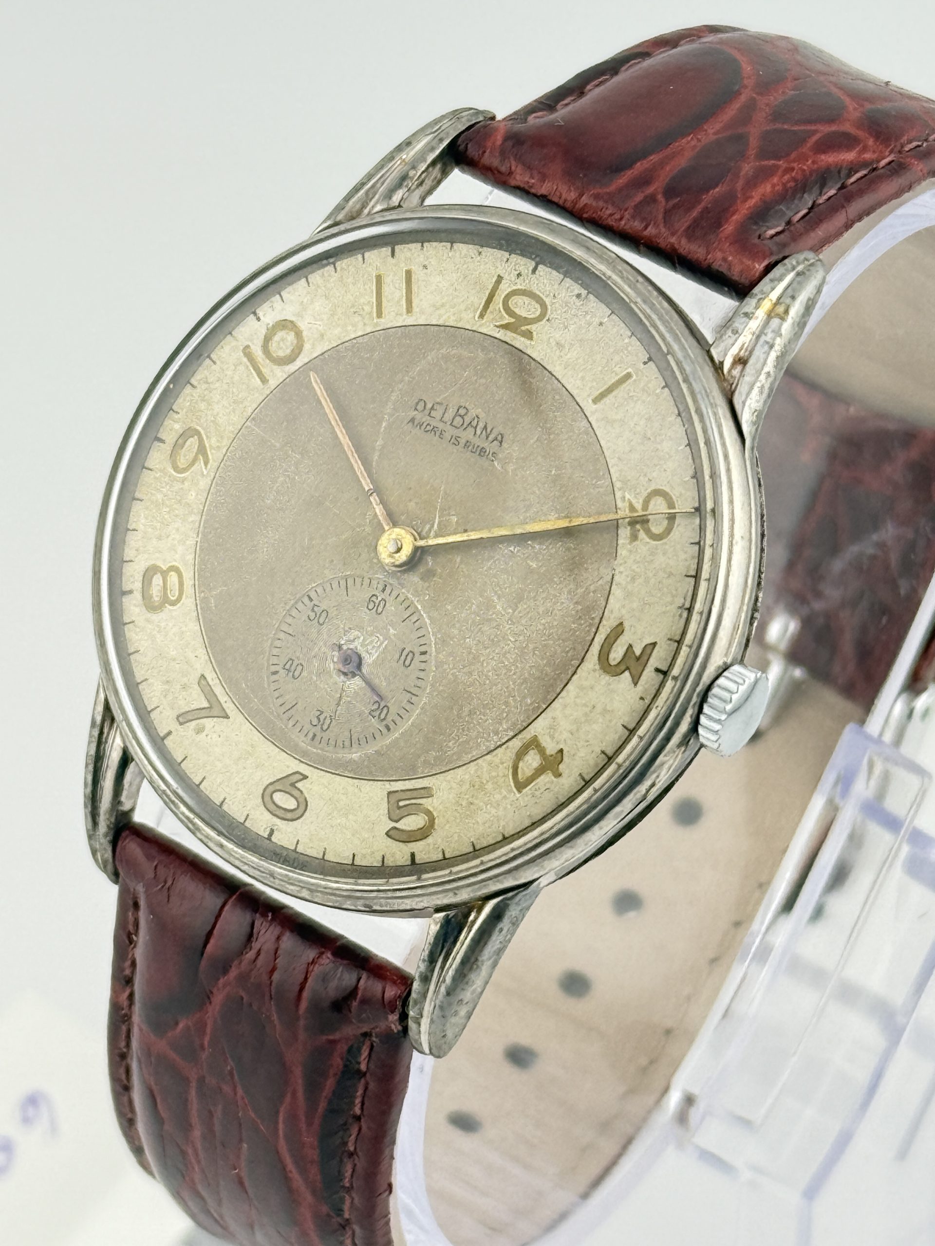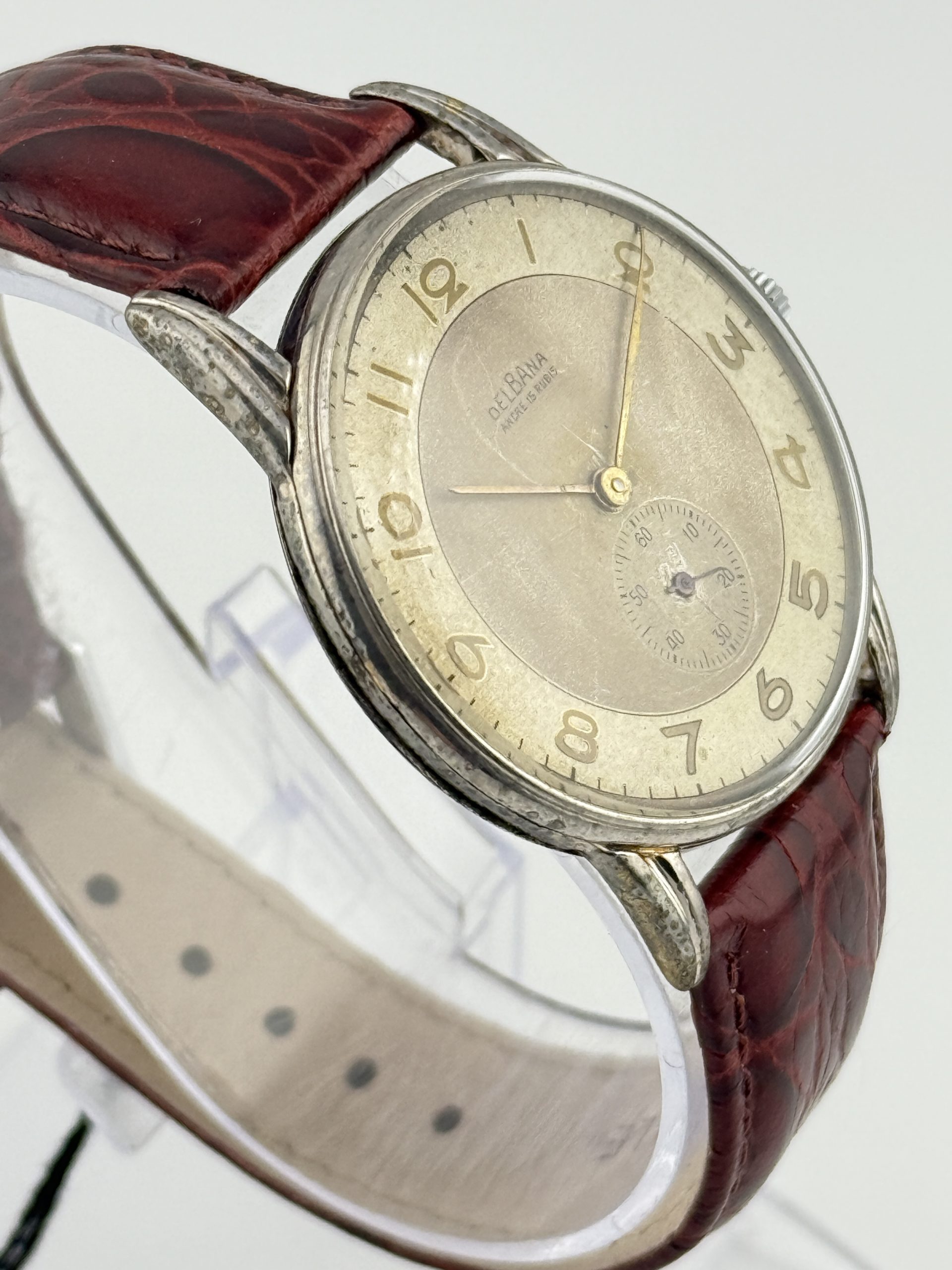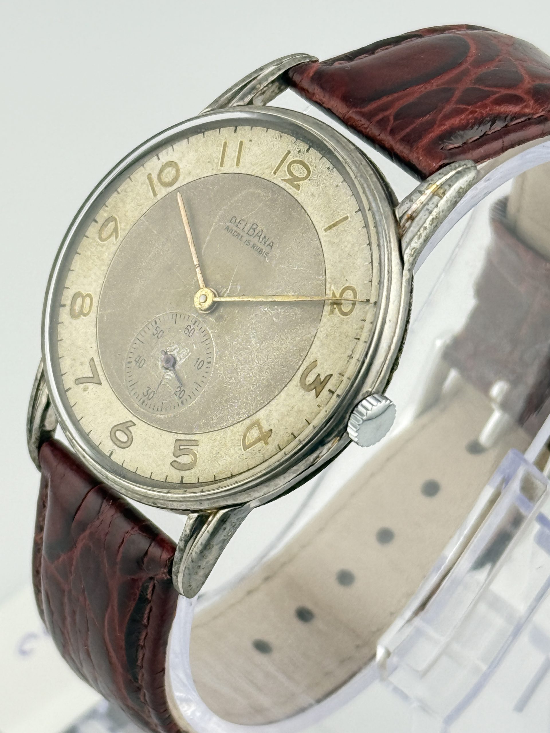 Accompagnato da un cinturino in pelle bordeaux, che ne esalta l’estetica rétro, questo Delbana non è solo un orologio, ma un vero pezzo di storia da indossare. Perfetto per chi desidera distinguersi con un modello raro, elegante e caratterizzato da proporzioni sorprendenti per il suo tempo.