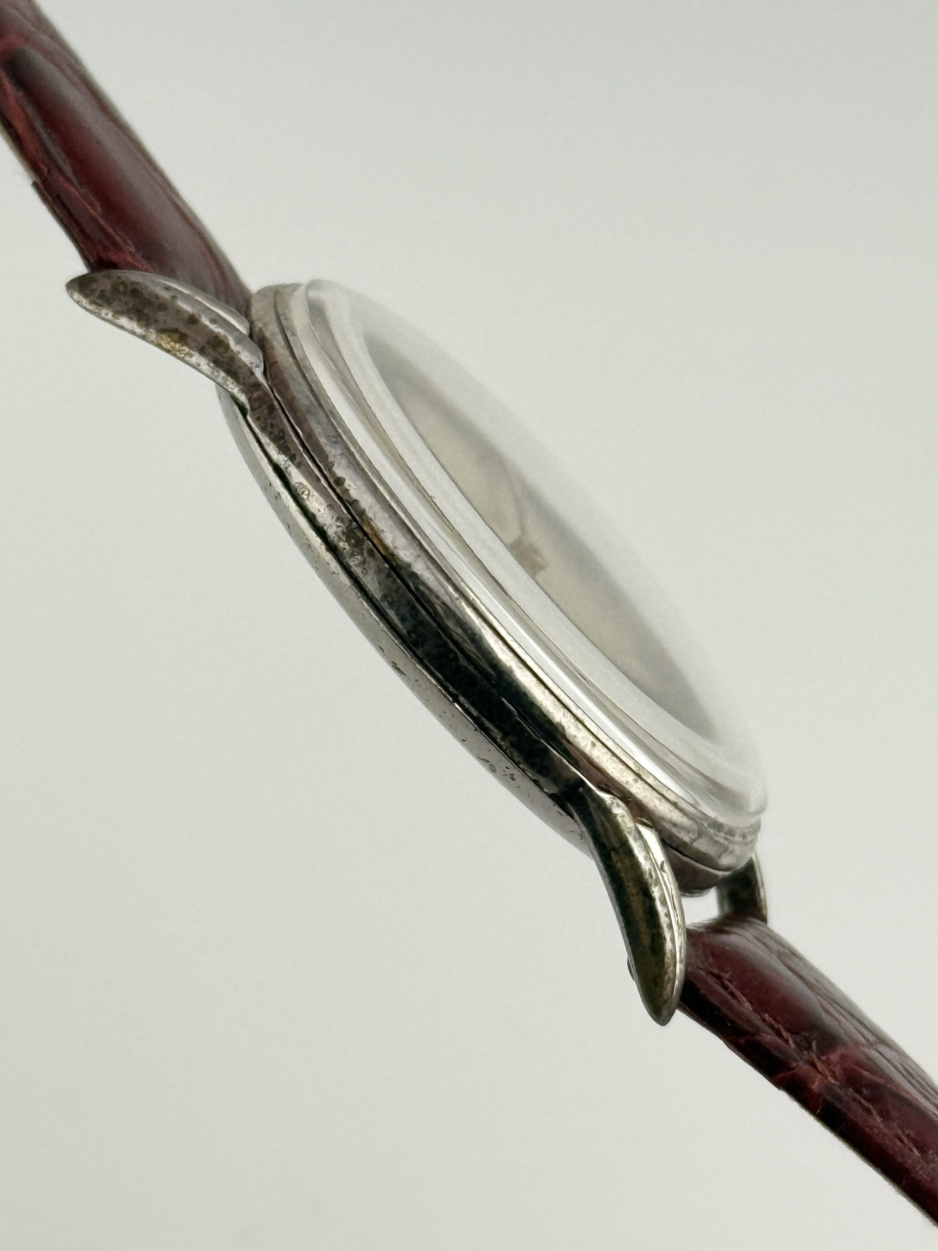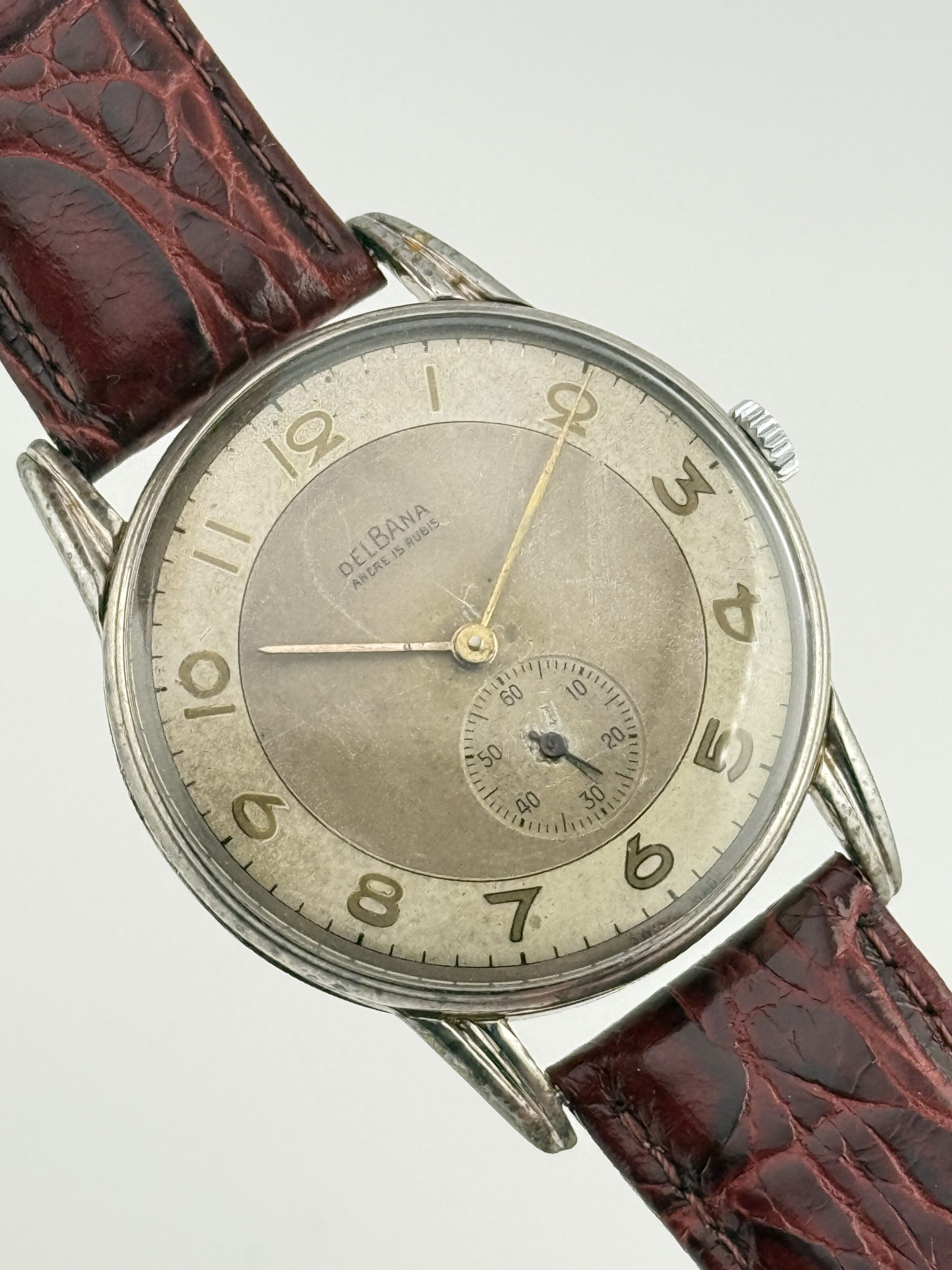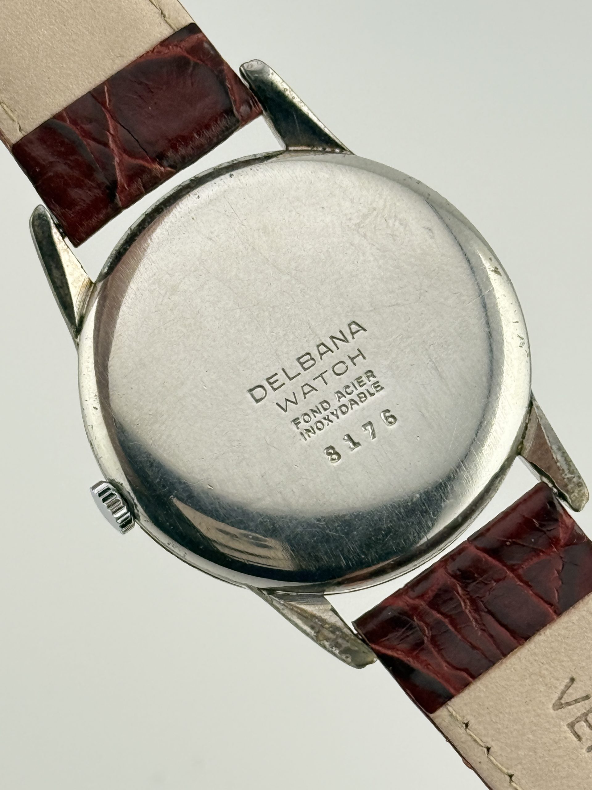 Accompagnato da un cinturino in pelle bordeaux, che ne esalta l’estetica rétro, questo Delbana non è solo un orologio, ma un vero pezzo di storia da indossare. Perfetto per chi desidera distinguersi con un modello raro, elegante e caratterizzato da proporzioni sorprendenti per il suo tempo.