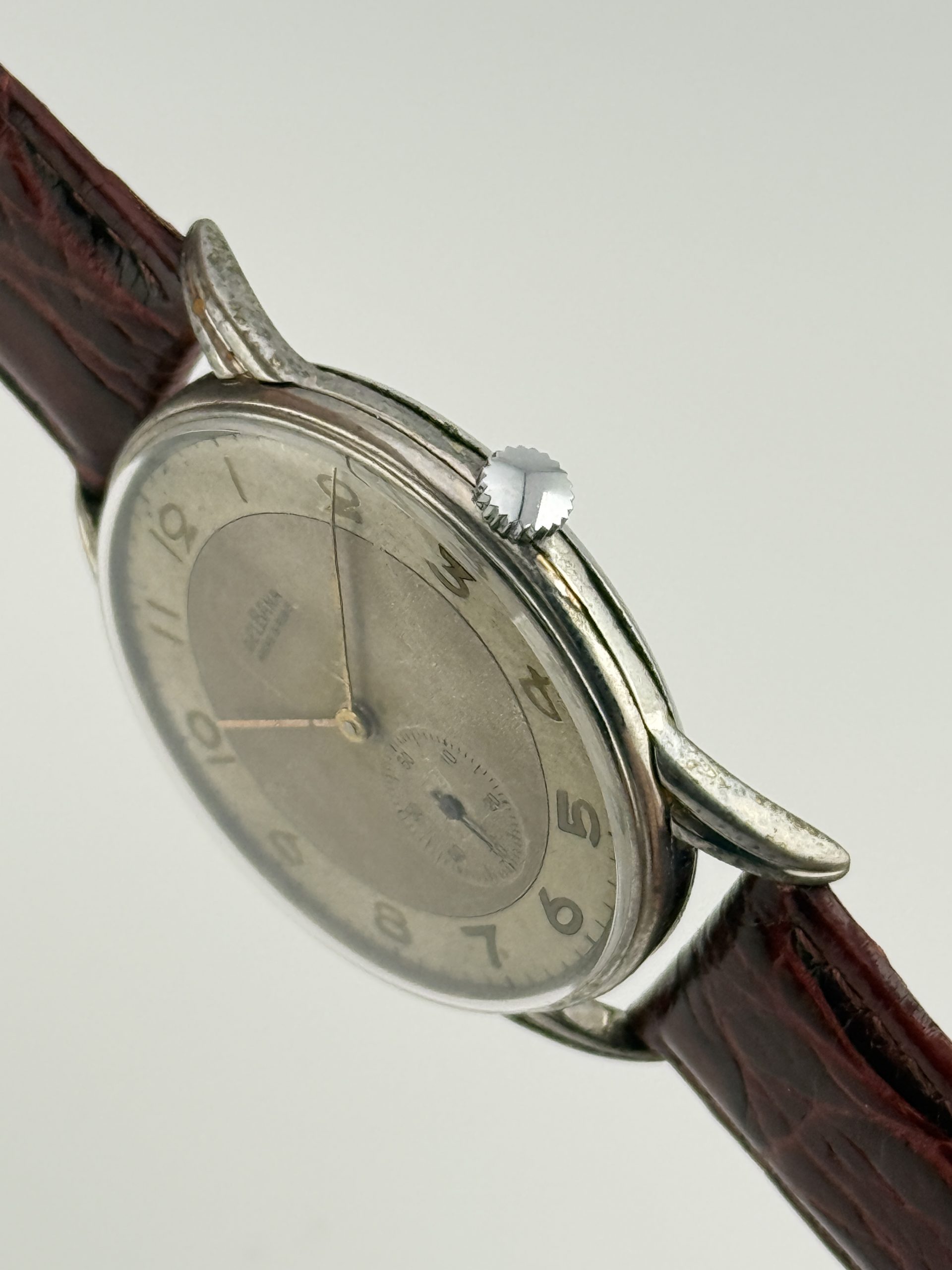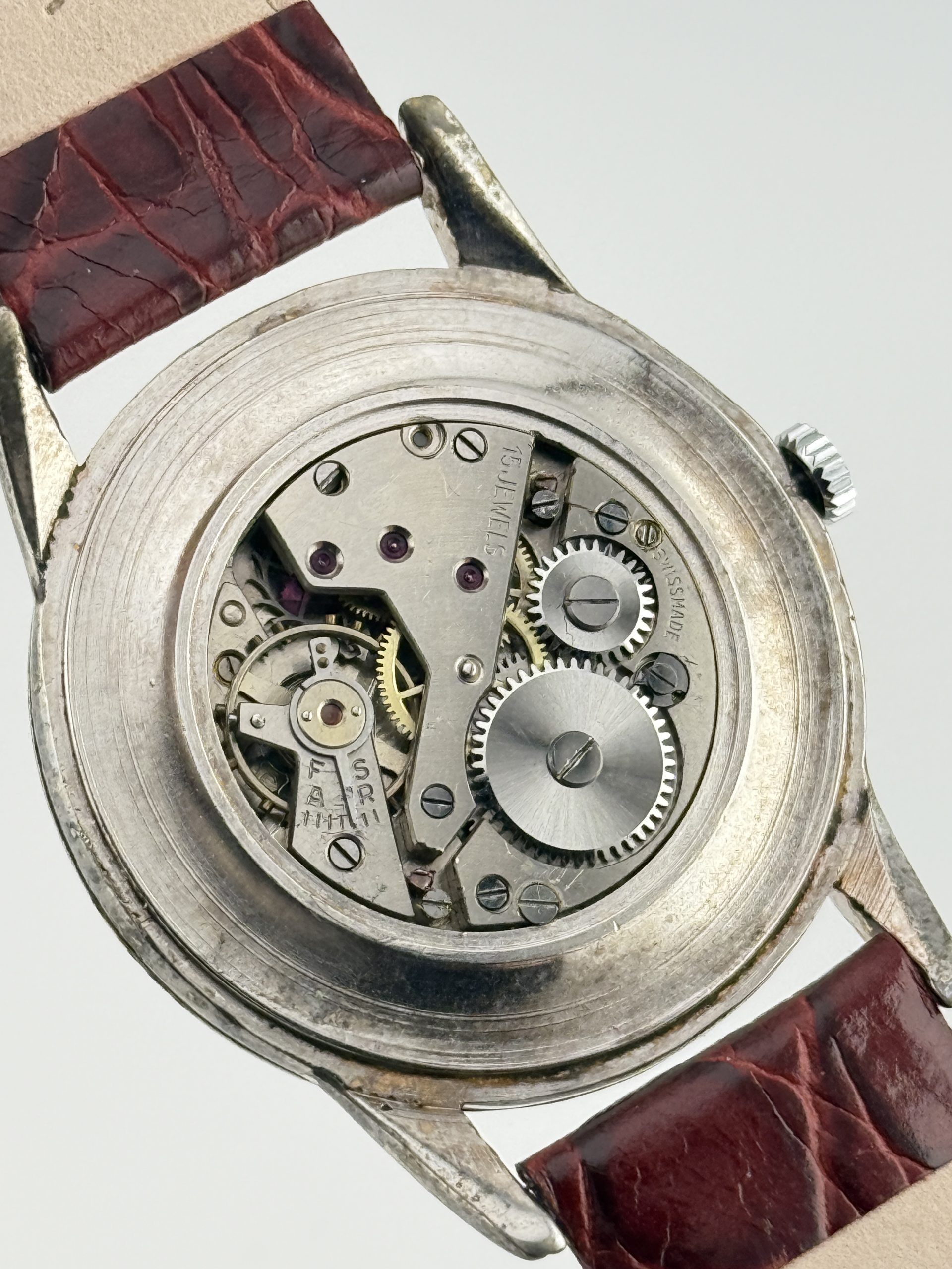 Il Delbana Oversize Vintage ref. 8176 è un orologio che racconta con eleganza lo spirito degli anni ’40, un periodo in cui l’orologeria stava vivendo un’evoluzione stilistica e tecnica senza precedenti. La sua cassa oversize da 38 mm – una misura molto generosa per l’epoca – lo rende immediatamente riconoscibile e ricercato tra i collezionisti, soprattutto perché conferisce al polso una presenza moderna pur mantenendo tutto il fascino del vintage.