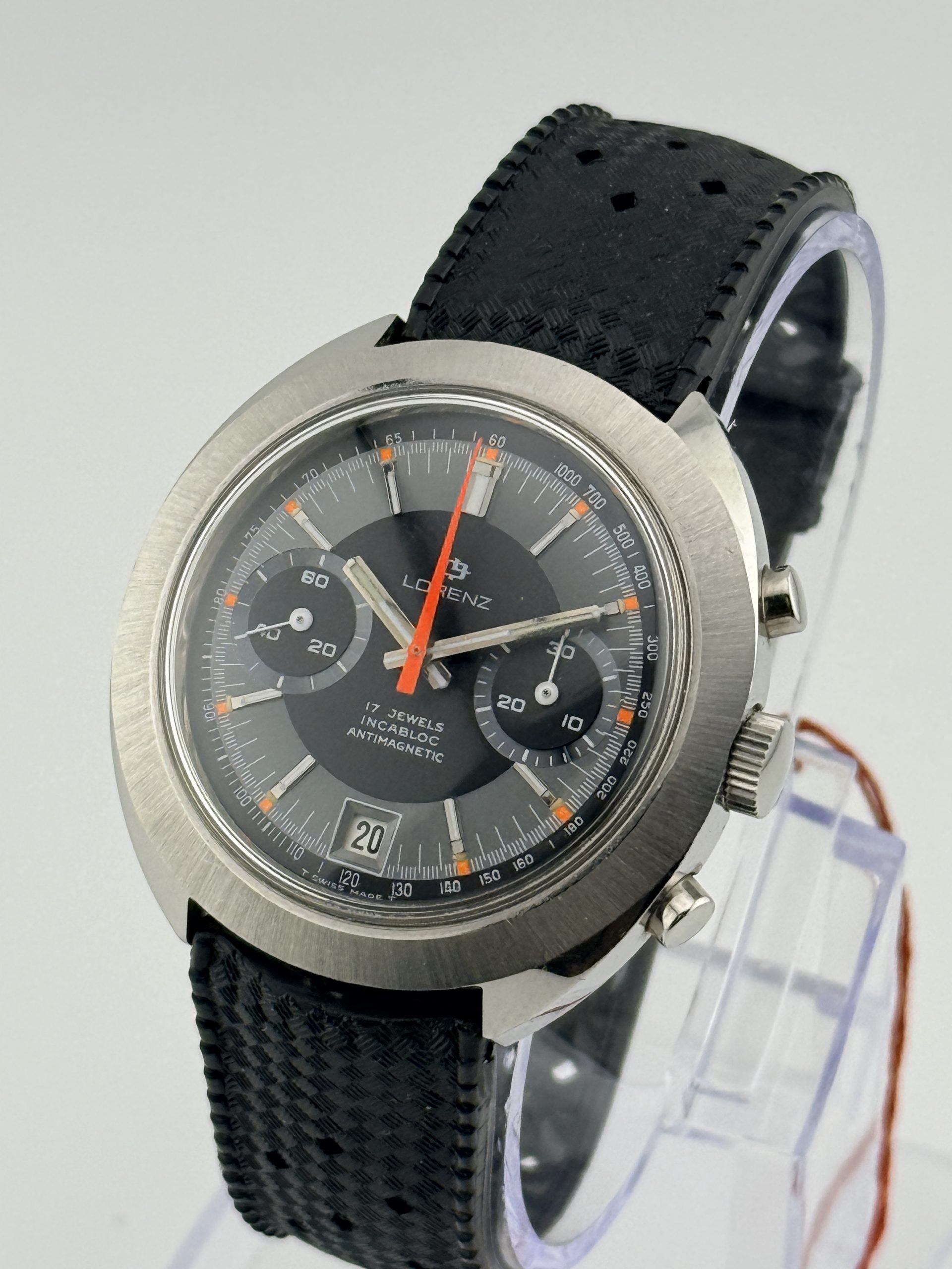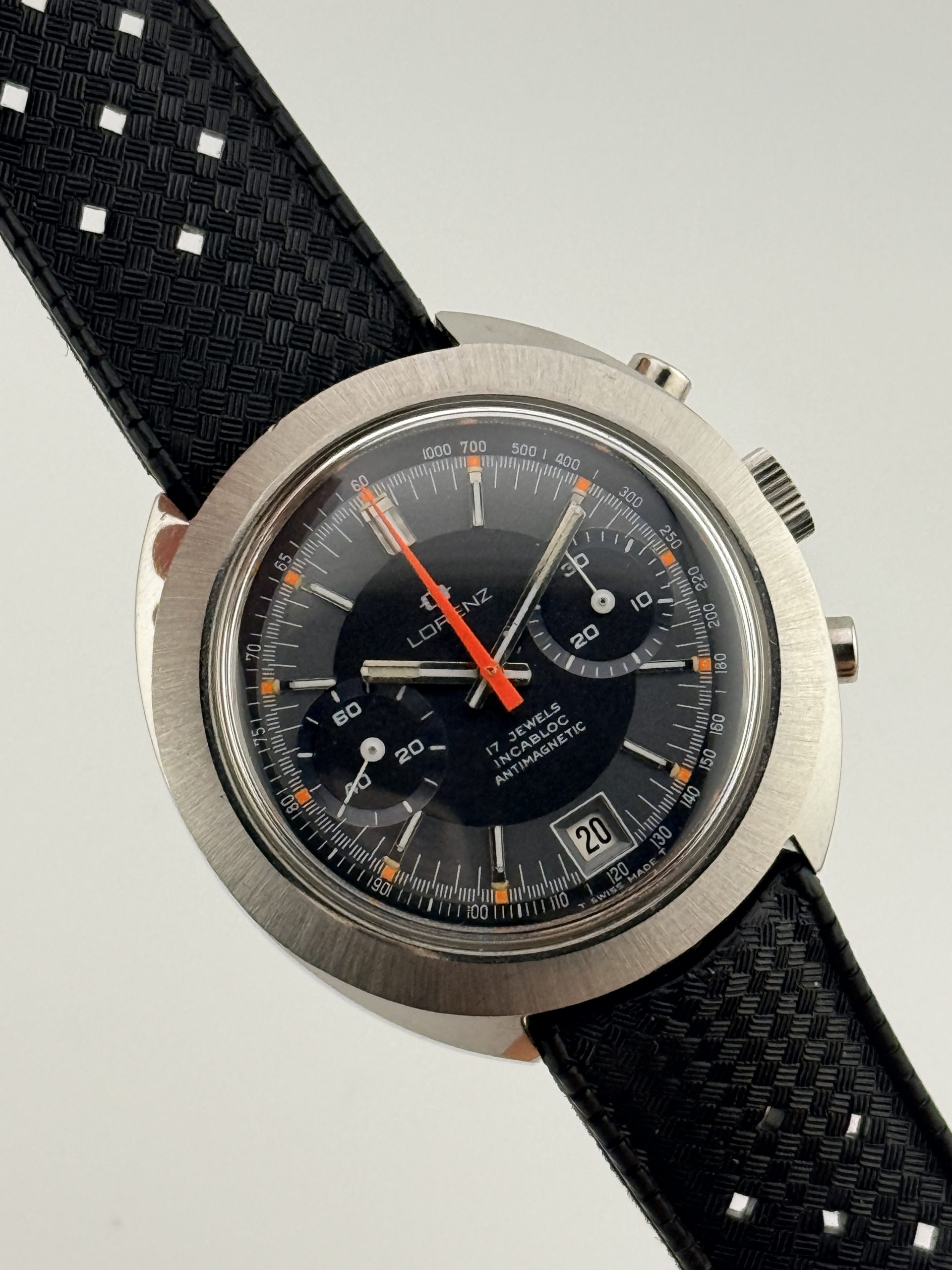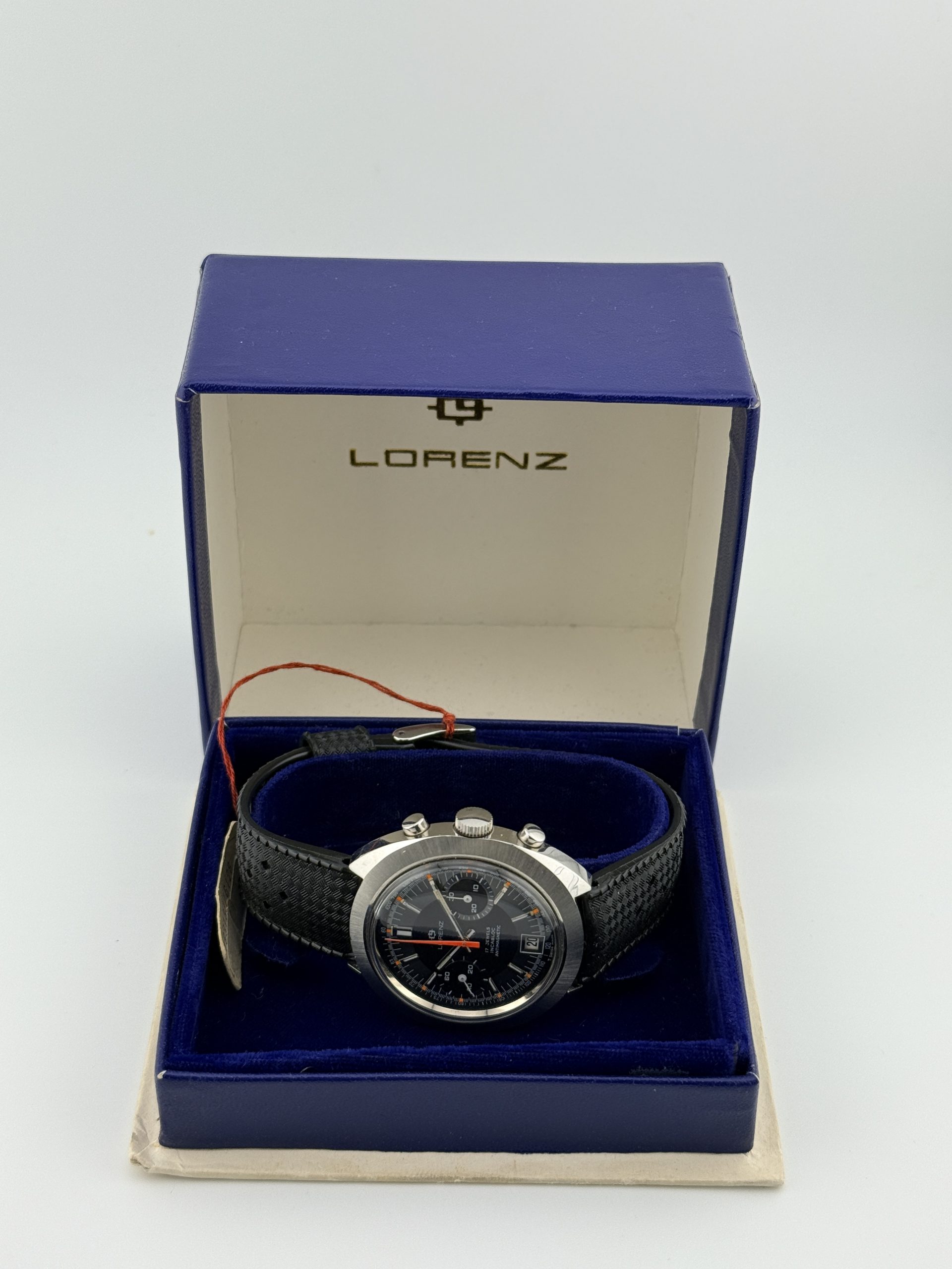 Affascinante Lorenz Chronograph ref. 4155 degli anni โ70, un cronografo sportivo dal forte carattere vintage che rappresenta perfettamente il design tecnico e funzionale di quel periodo. Lorenz รจ uno dei marchi storici dellโorologeria italiana e questo modello incarna alla perfezione lโestetica dinamica e innovativa tipica della produzione dellโepoca.