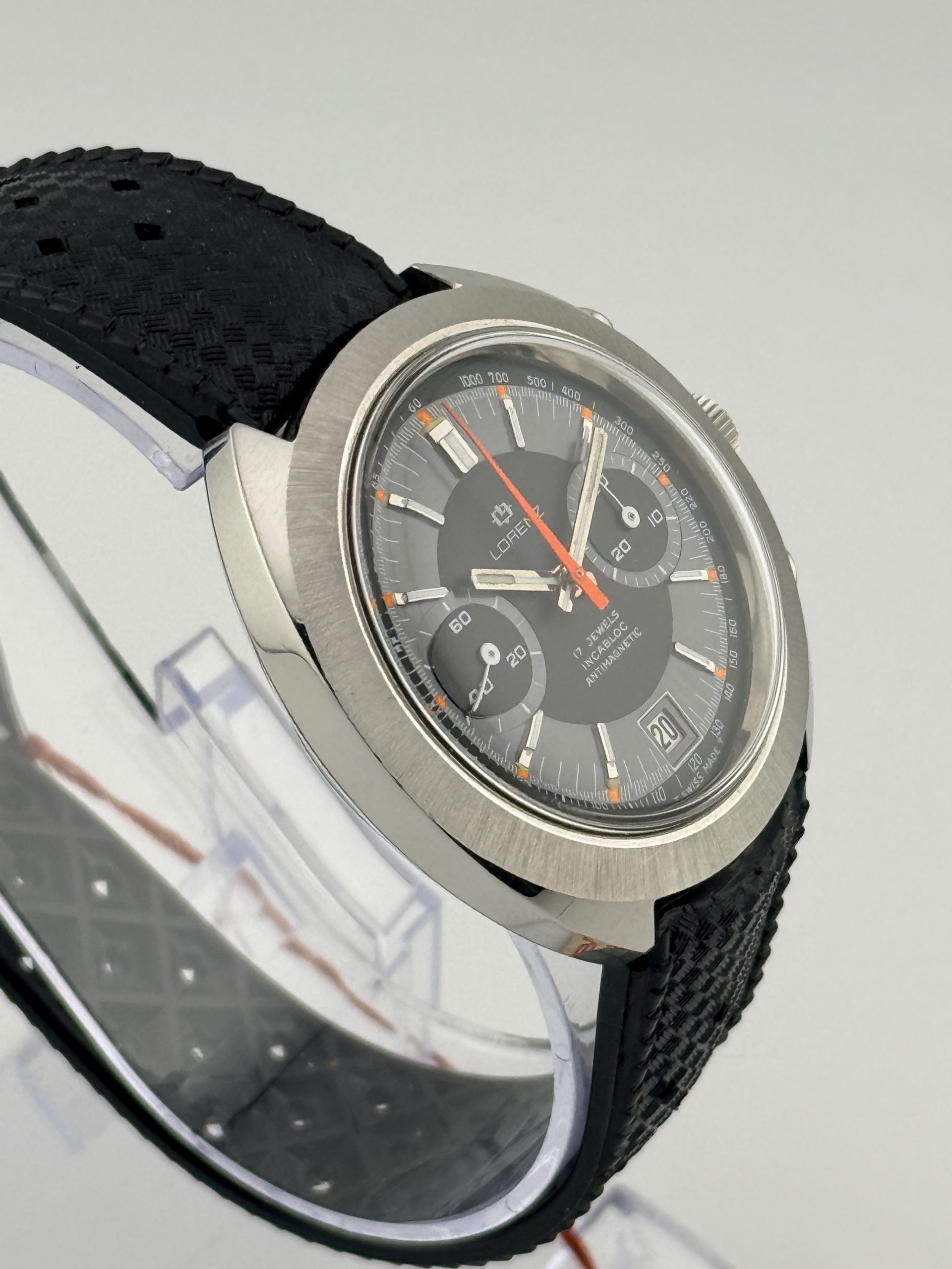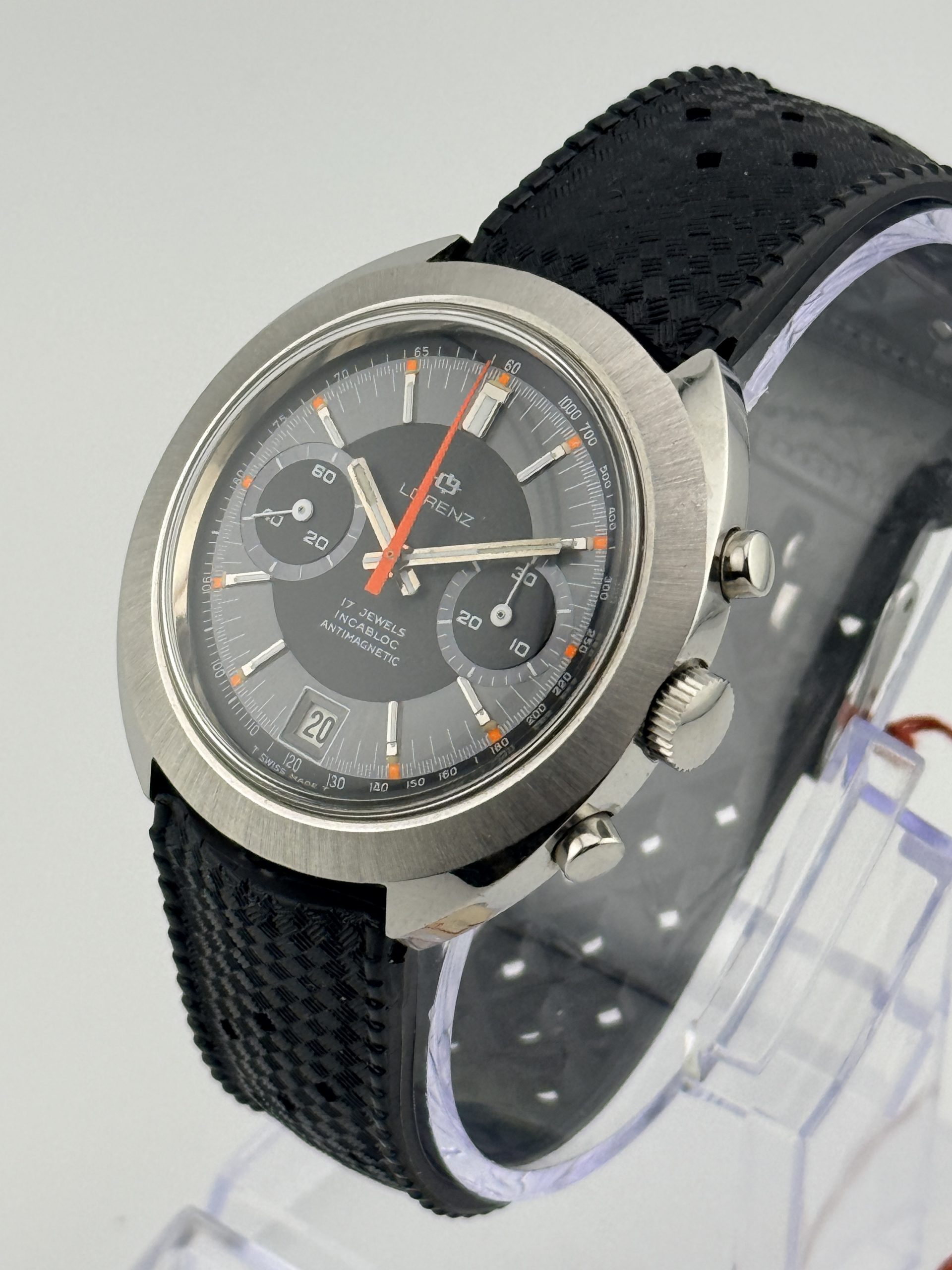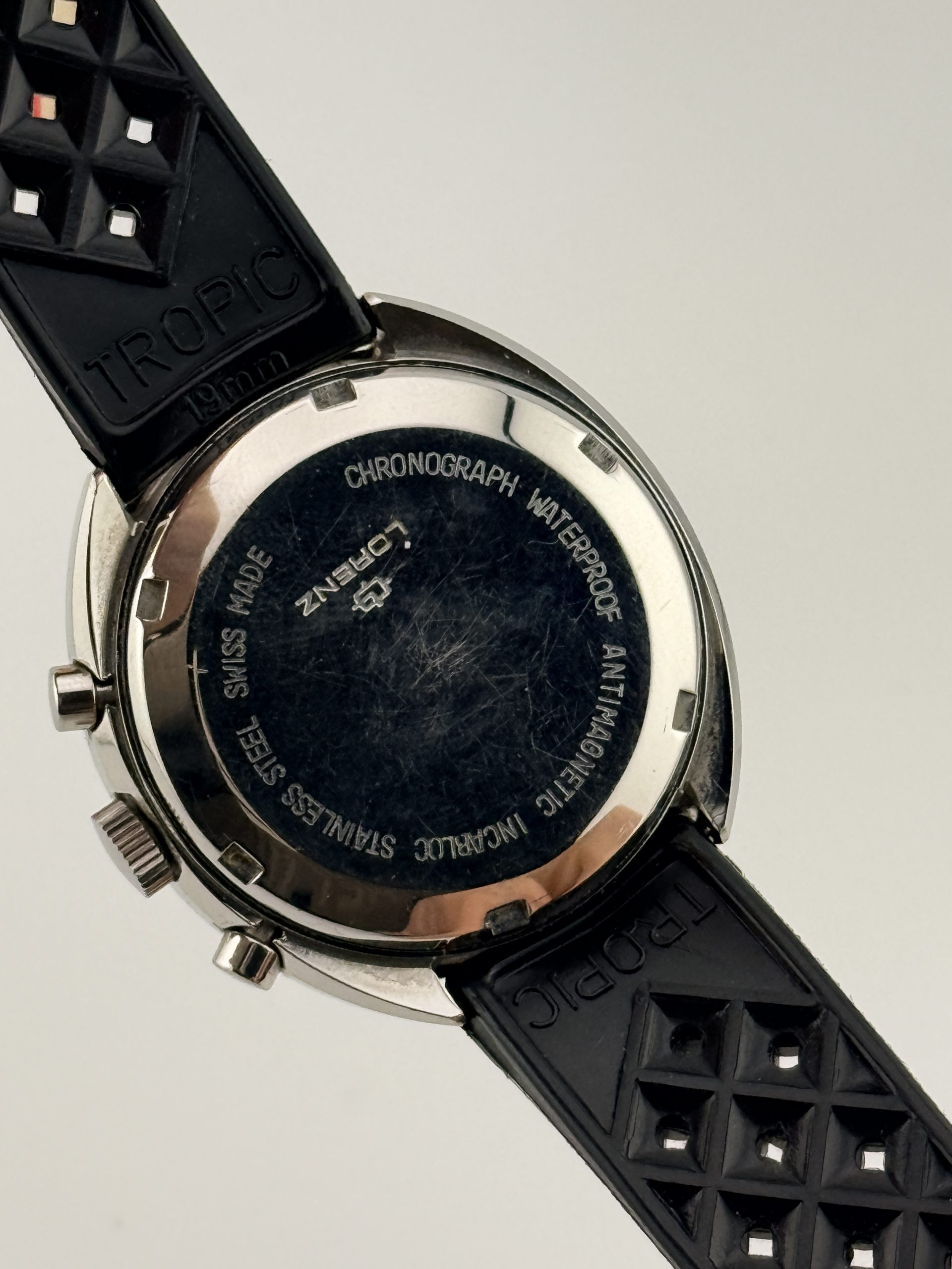 Affascinante Lorenz Chronograph ref. 4155 degli anni โ70, un cronografo sportivo dal forte carattere vintage che rappresenta perfettamente il design tecnico e funzionale di quel periodo. Lorenz รจ uno dei marchi storici dellโorologeria italiana e questo modello incarna alla perfezione lโestetica dinamica e innovativa tipica della produzione dellโepoca.