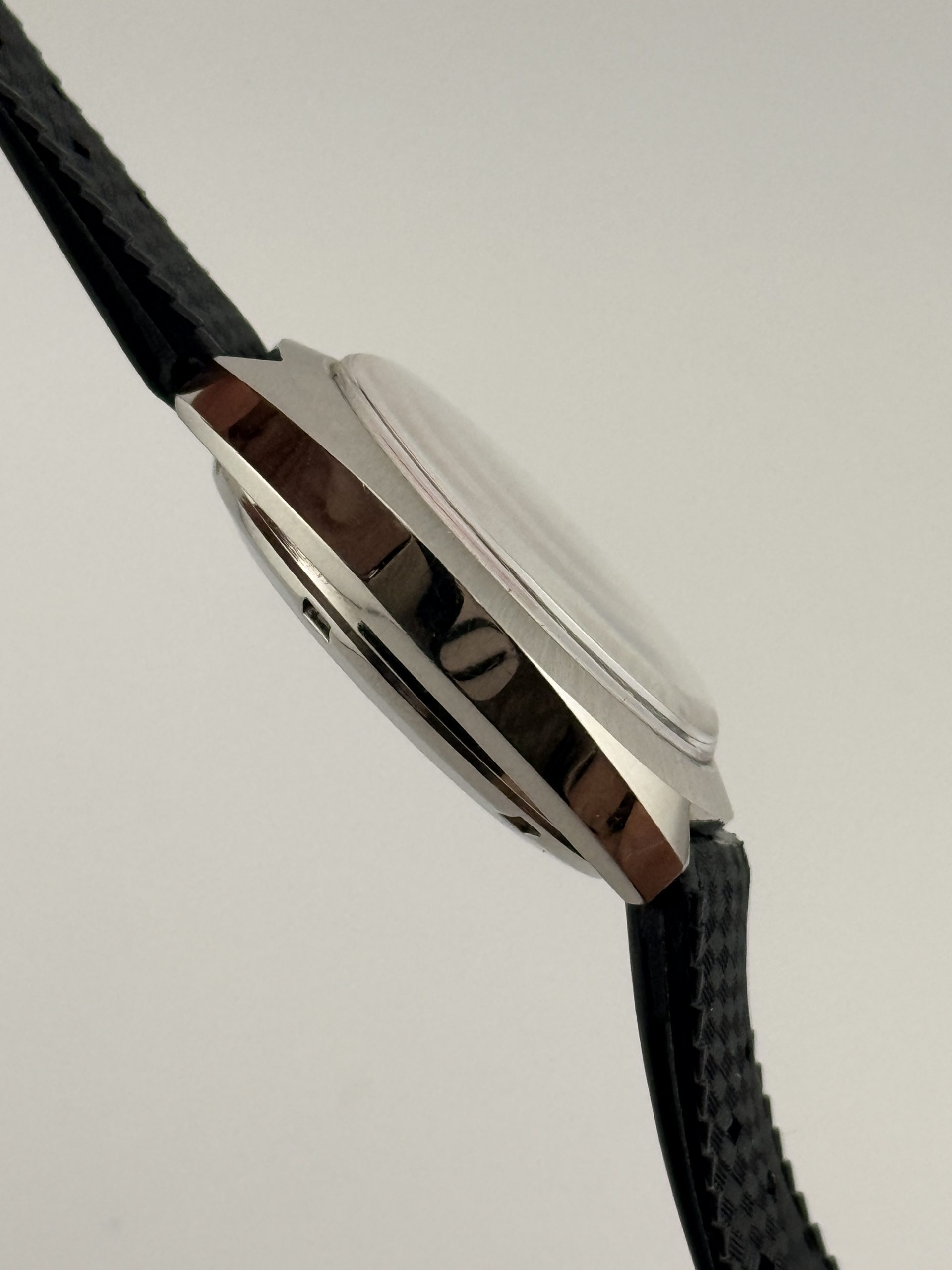 Questo esemplare รจ particolarmente interessante perchรฉ New Old Stock, conservato in condizioni eccellenti e accompagnato dalla scatola originale Lorenz, un dettaglio sempre molto ricercato dai collezionisti. Il cinturino in gomma nera completa perfettamente lโestetica sportiva del modello.