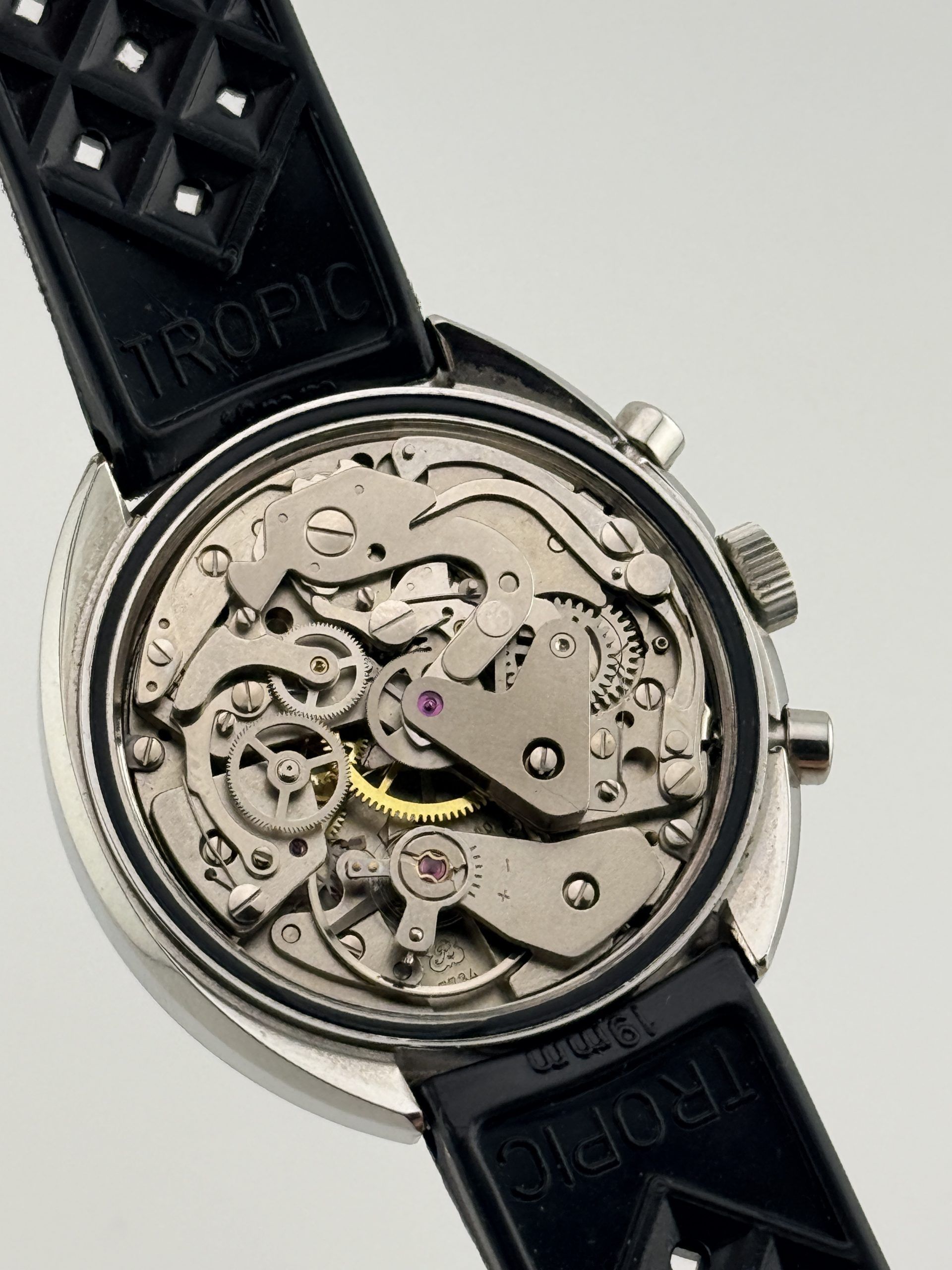 Allโinterno lavora il celebre calibro manuale Valjoux 7734, uno dei movimenti cronografici piรน affidabili e apprezzati della produzione svizzera dellโepoca, noto per robustezza, precisione e facilitร di manutenzione.