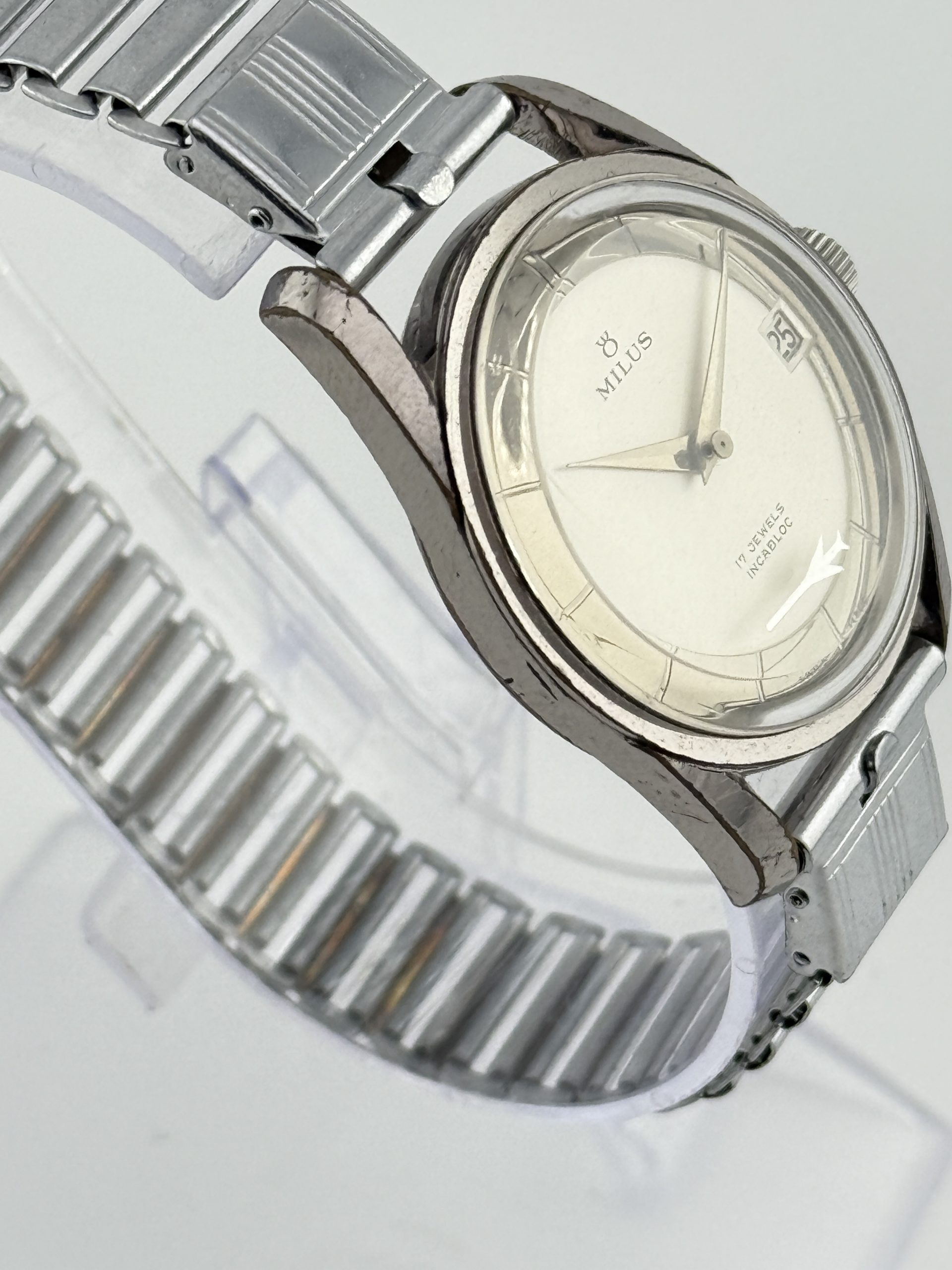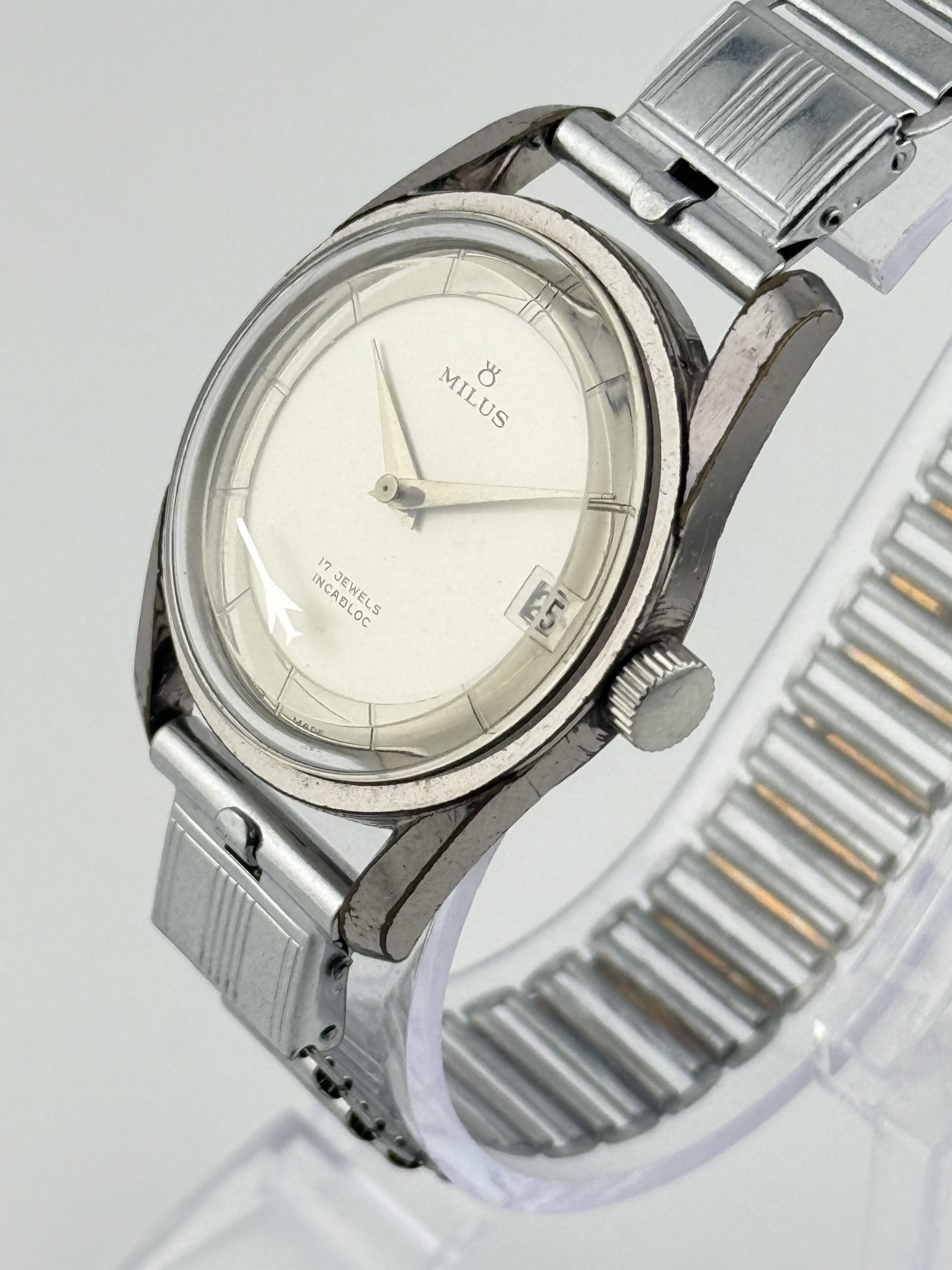 Al polso è leggero e confortevole, con un vetro plexiglas che diffonde riflessi morbidi e caldi tipici del vintage. È un segnatempo che racconta una stagione in cui Milus esprimeva la propria creatività con soluzioni originali e inedite, capaci di distinguersi in un mercato affollato.