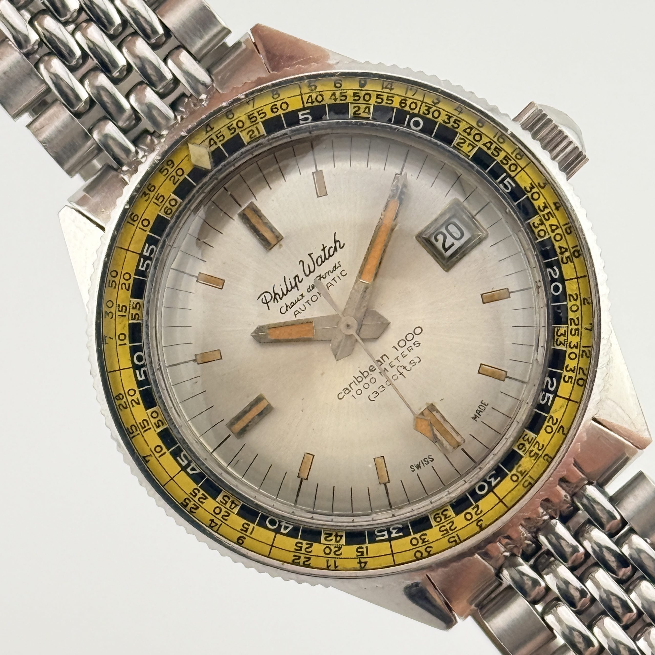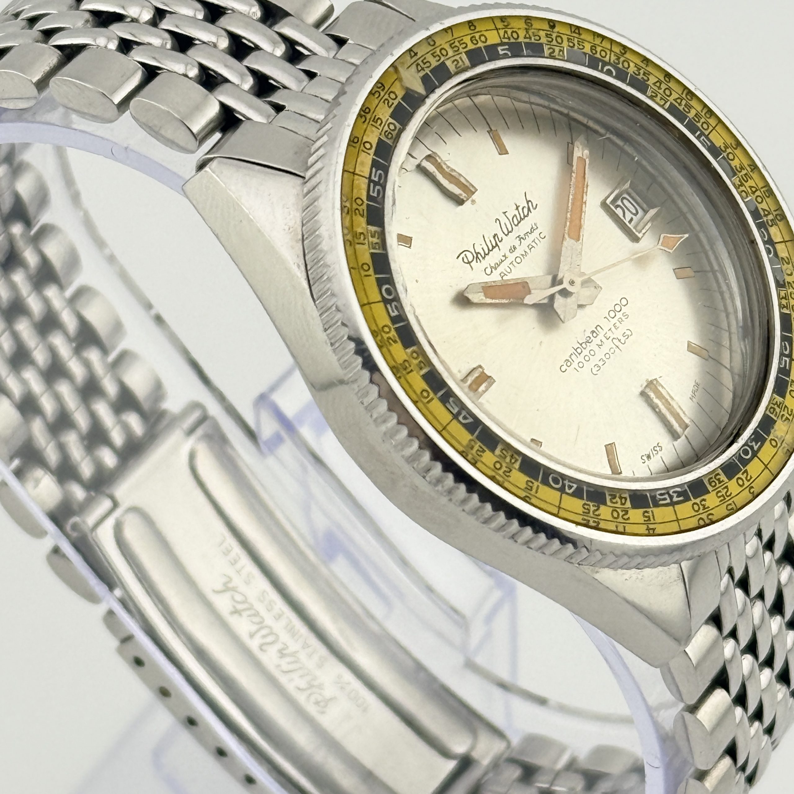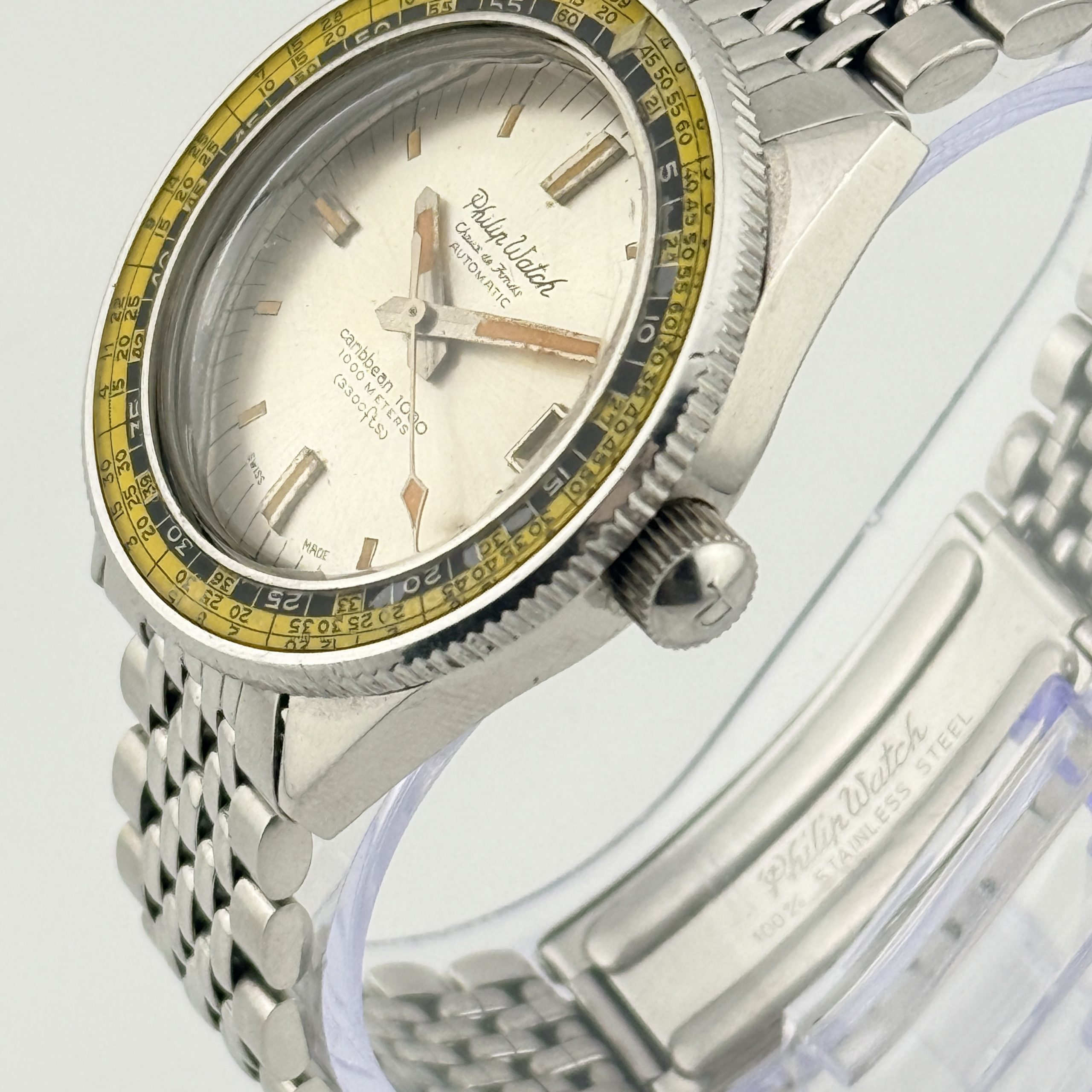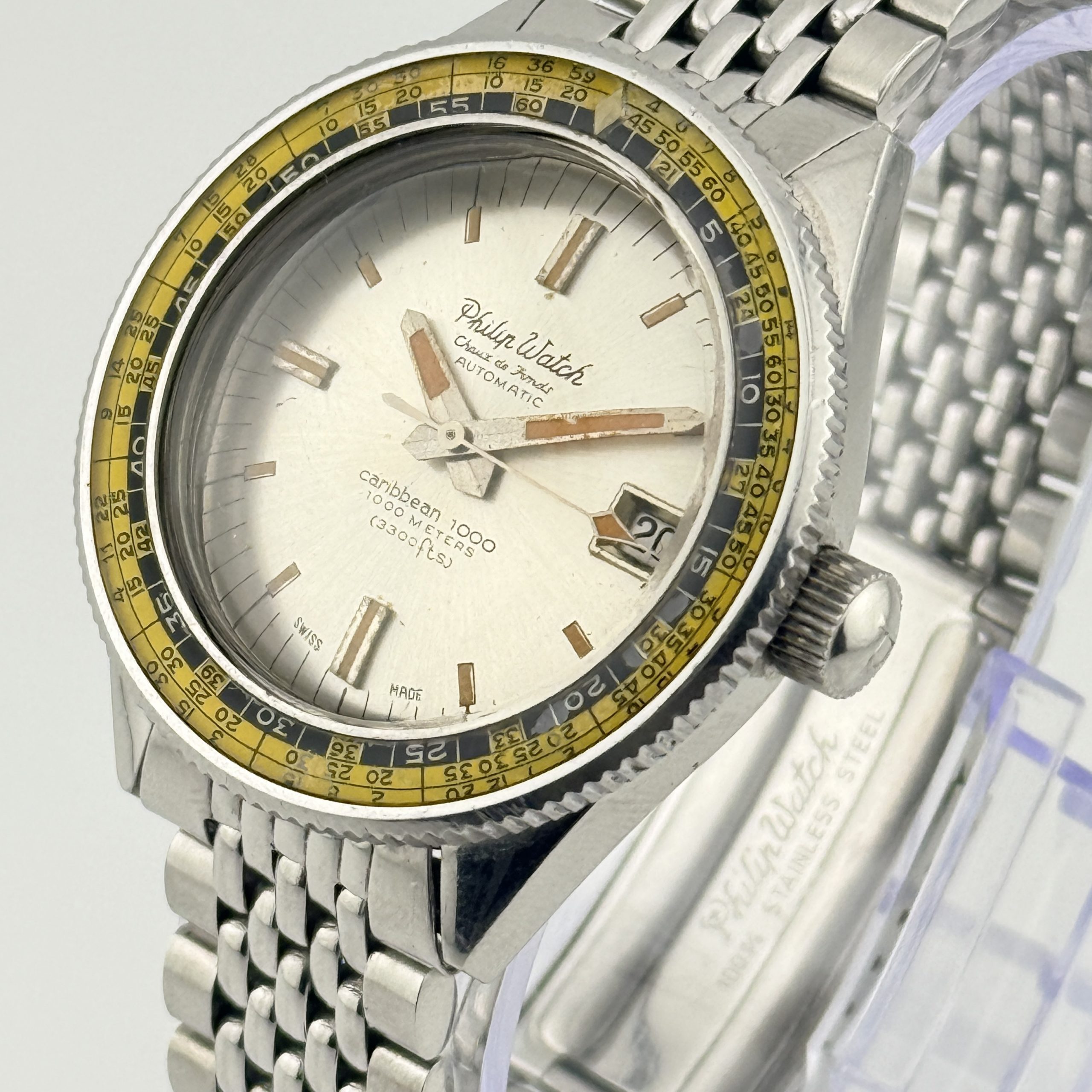 Per il collezionista esperto, questo Philip Watch Caribbean 1000 ref. 702 rappresenta una variante di eccezionale interesse: la configurazione con quadrante chiaro โalbinoโ, decisamente piรน rara rispetto alla classica versione nera. Una scelta estetica insolita per un diver professionale degli anni โ60, che rende questo esemplare particolarmente ricercato e distintivo.