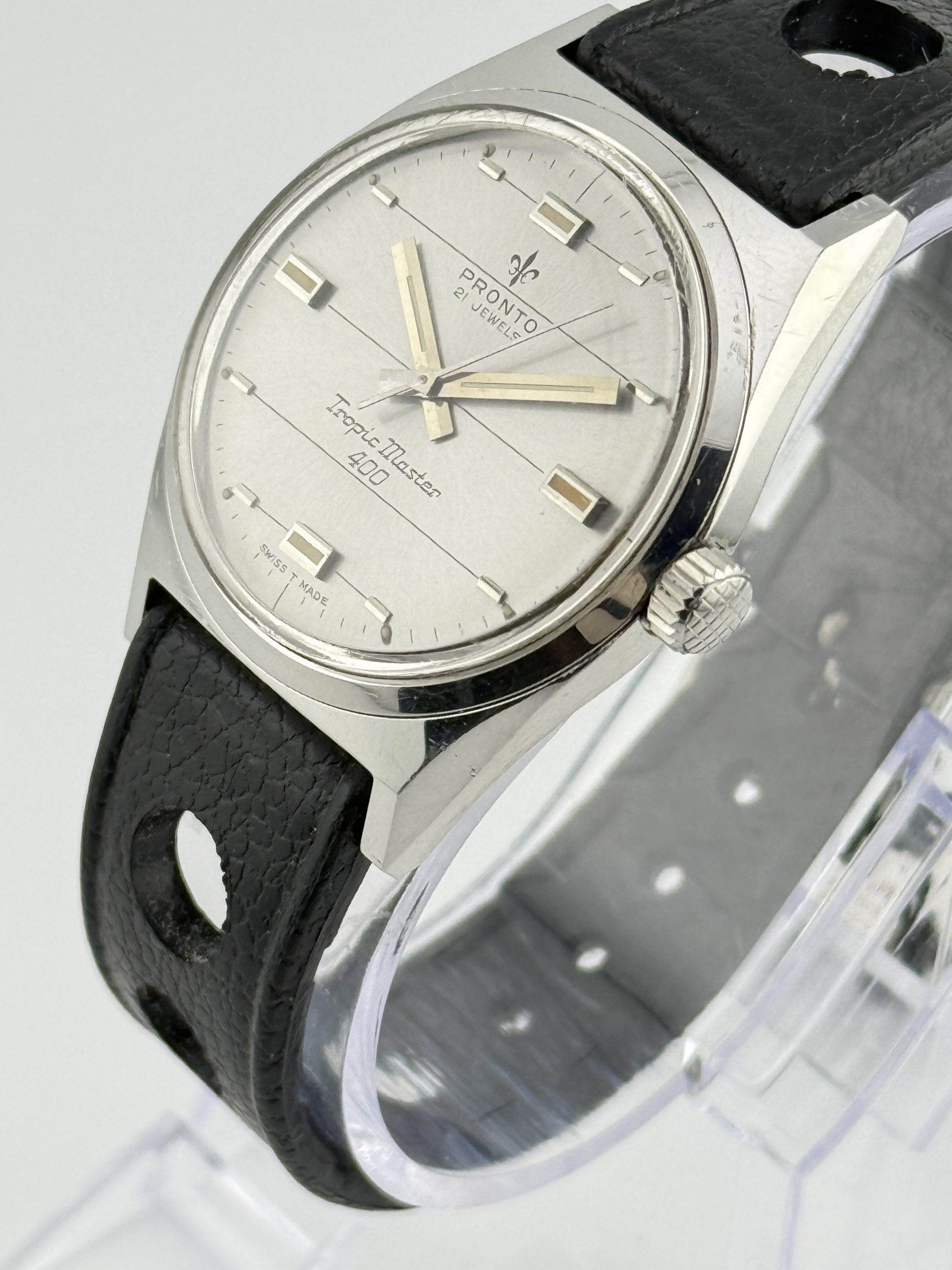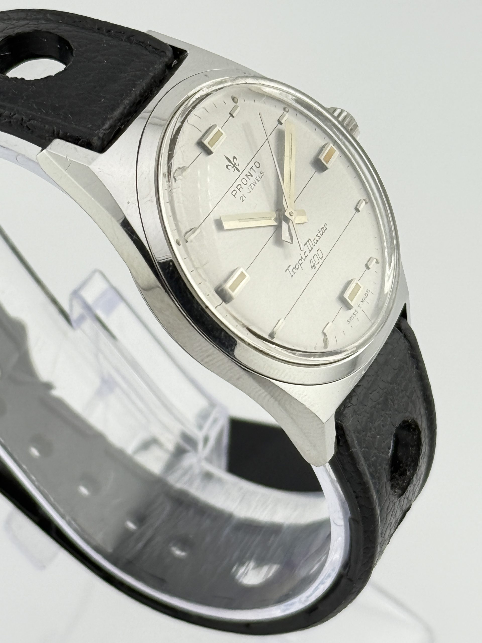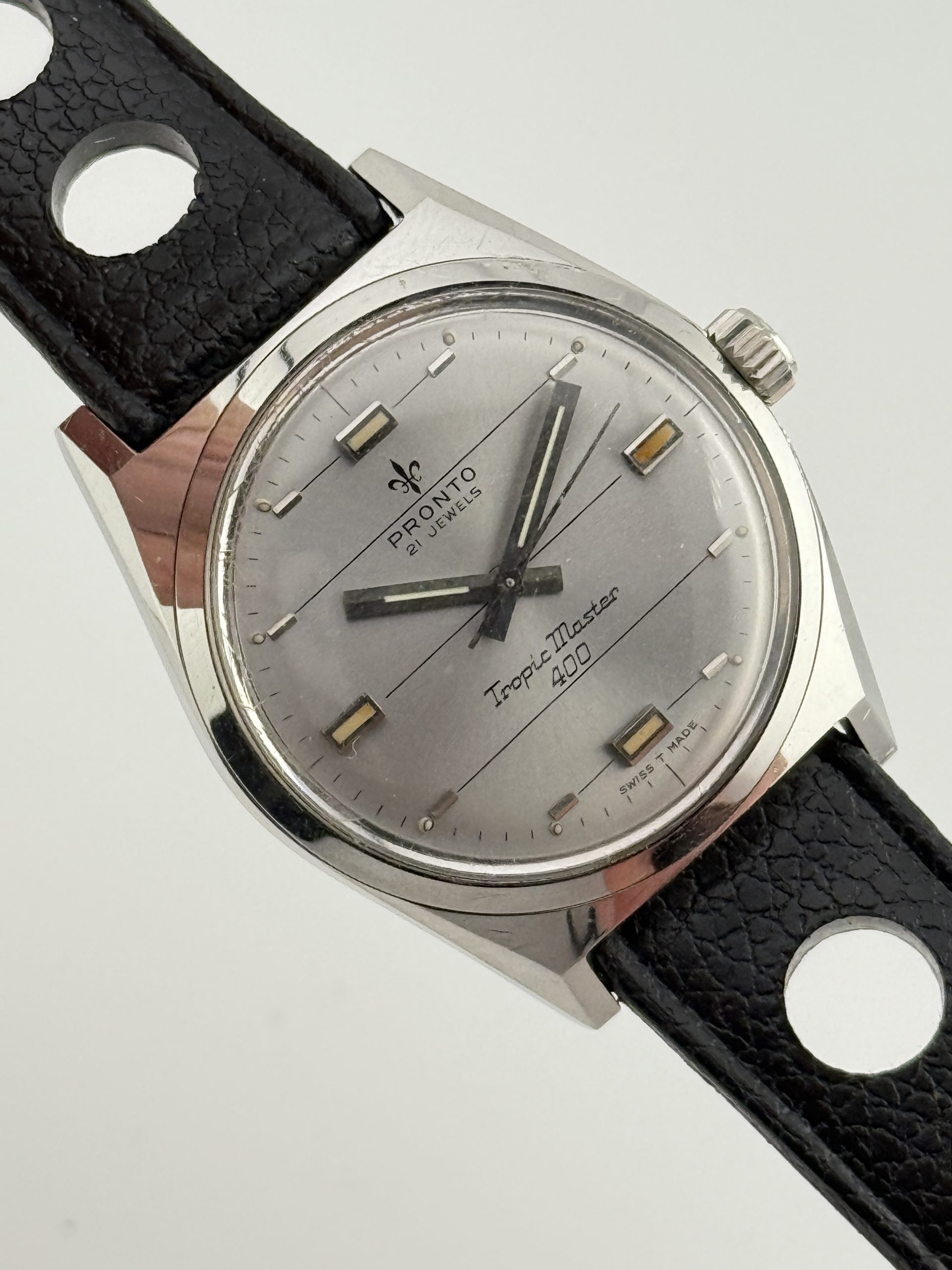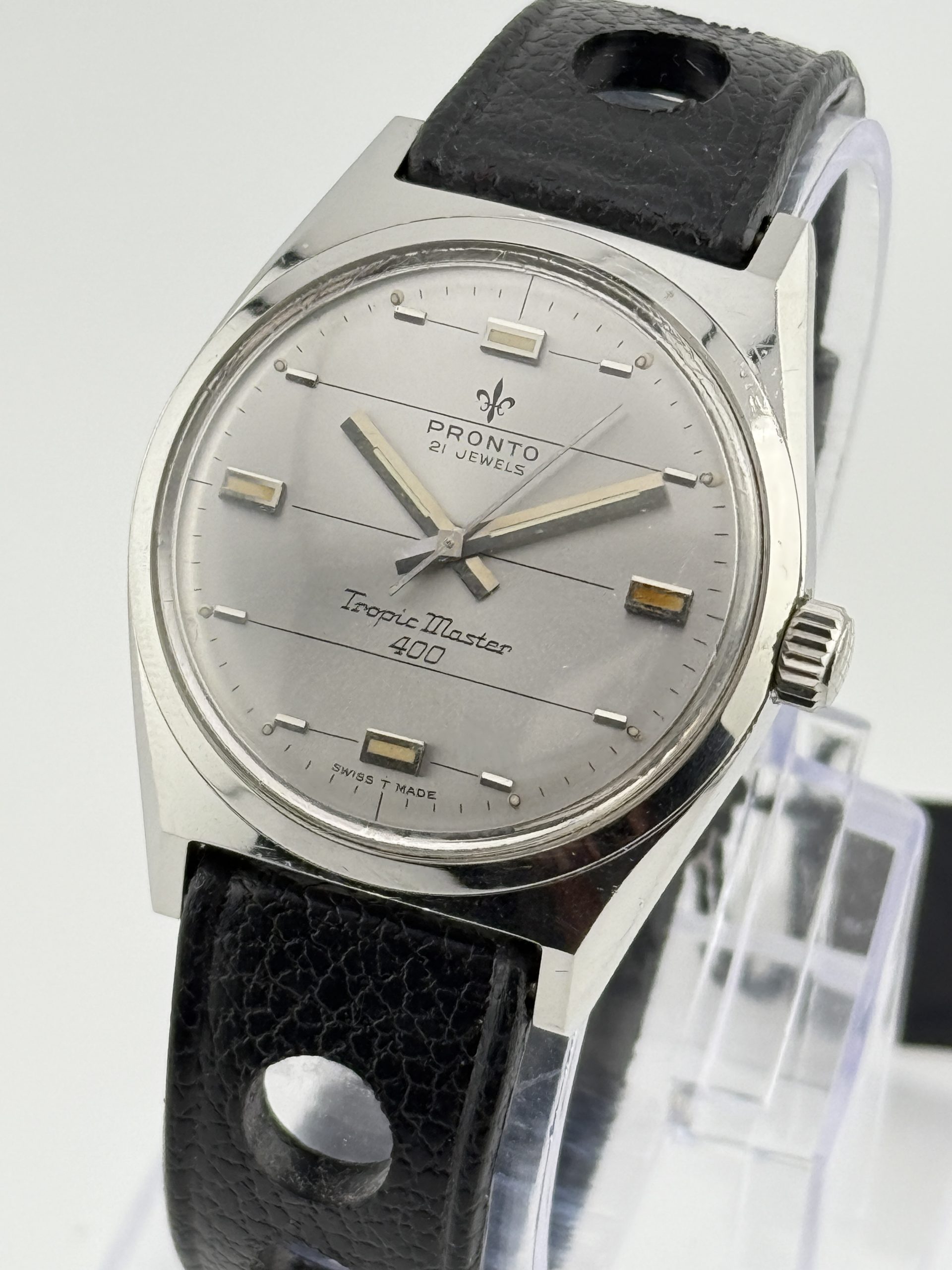 Il Pronto Tropic Master 400, prodotto negli anni ’60, è un diver vintage raro e affascinante, espressione della grande tradizione svizzera legata alle casse compressor, particolarmente amate dagli appassionati per il loro mix di robustezza ed eleganza sportiva.