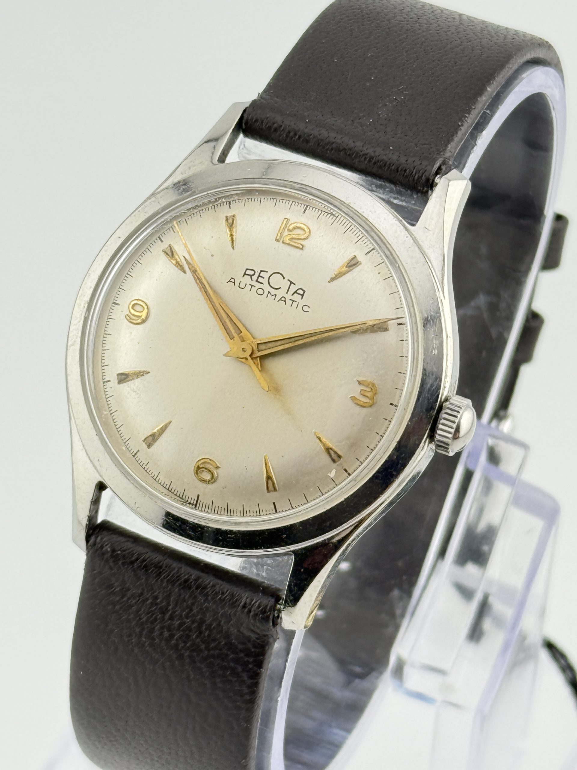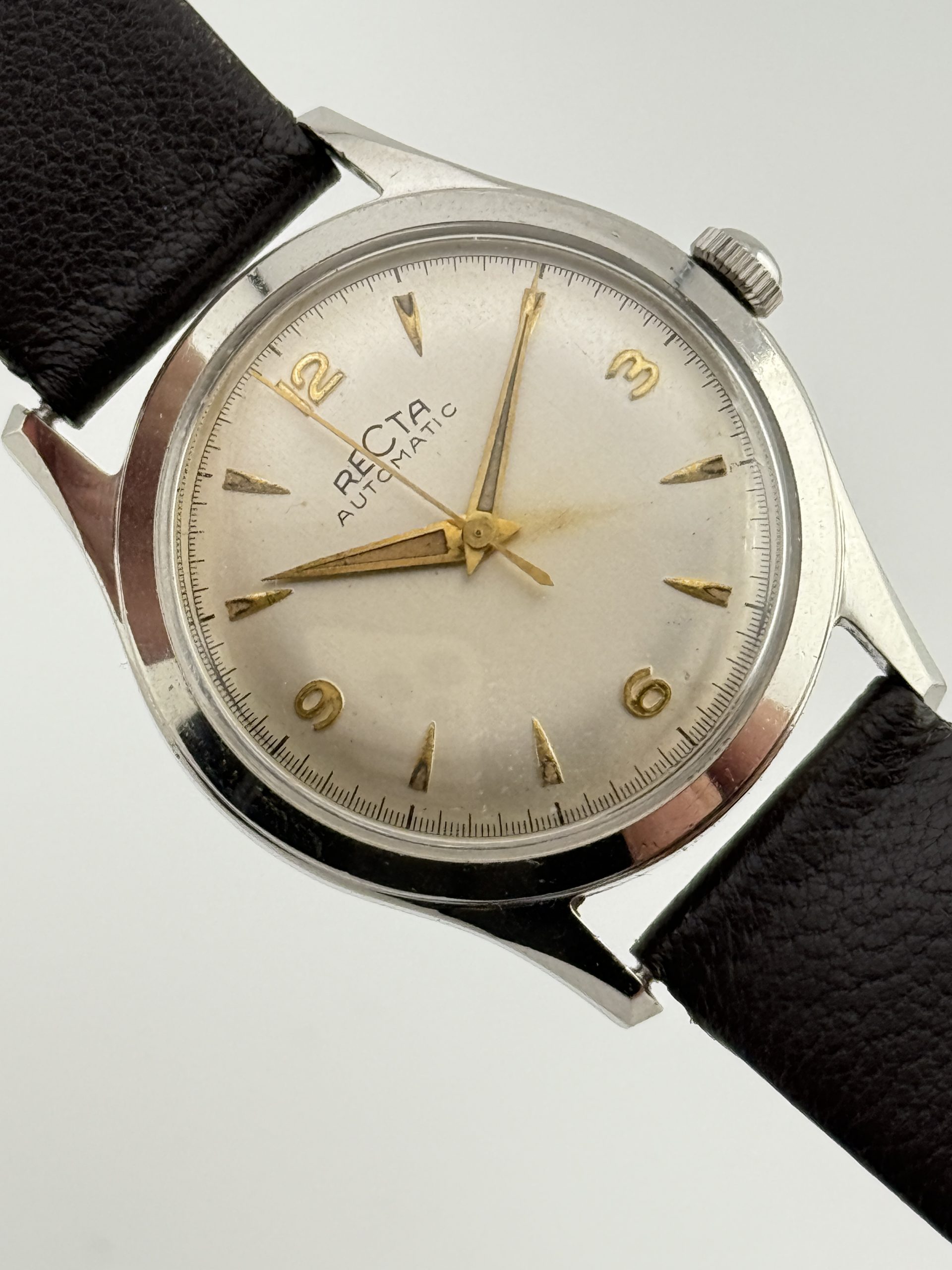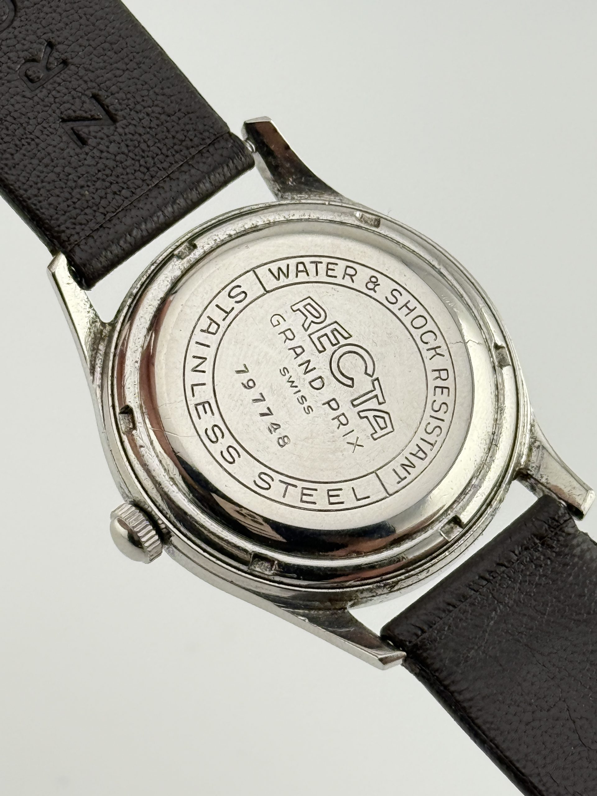 Un nome che richiama subito competizione e prestigio: Recta Grand Prix. Siamo nella metà degli anni ’50, un periodo in cui il design degli orologi automatici iniziava a trovare un equilibrio tra la robustezza sportiva e la sobria eleganza da indossare tutti i giorni.