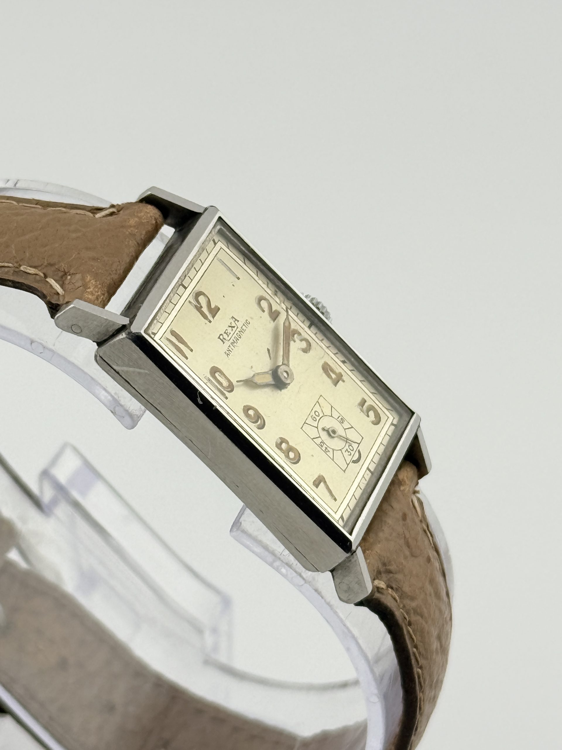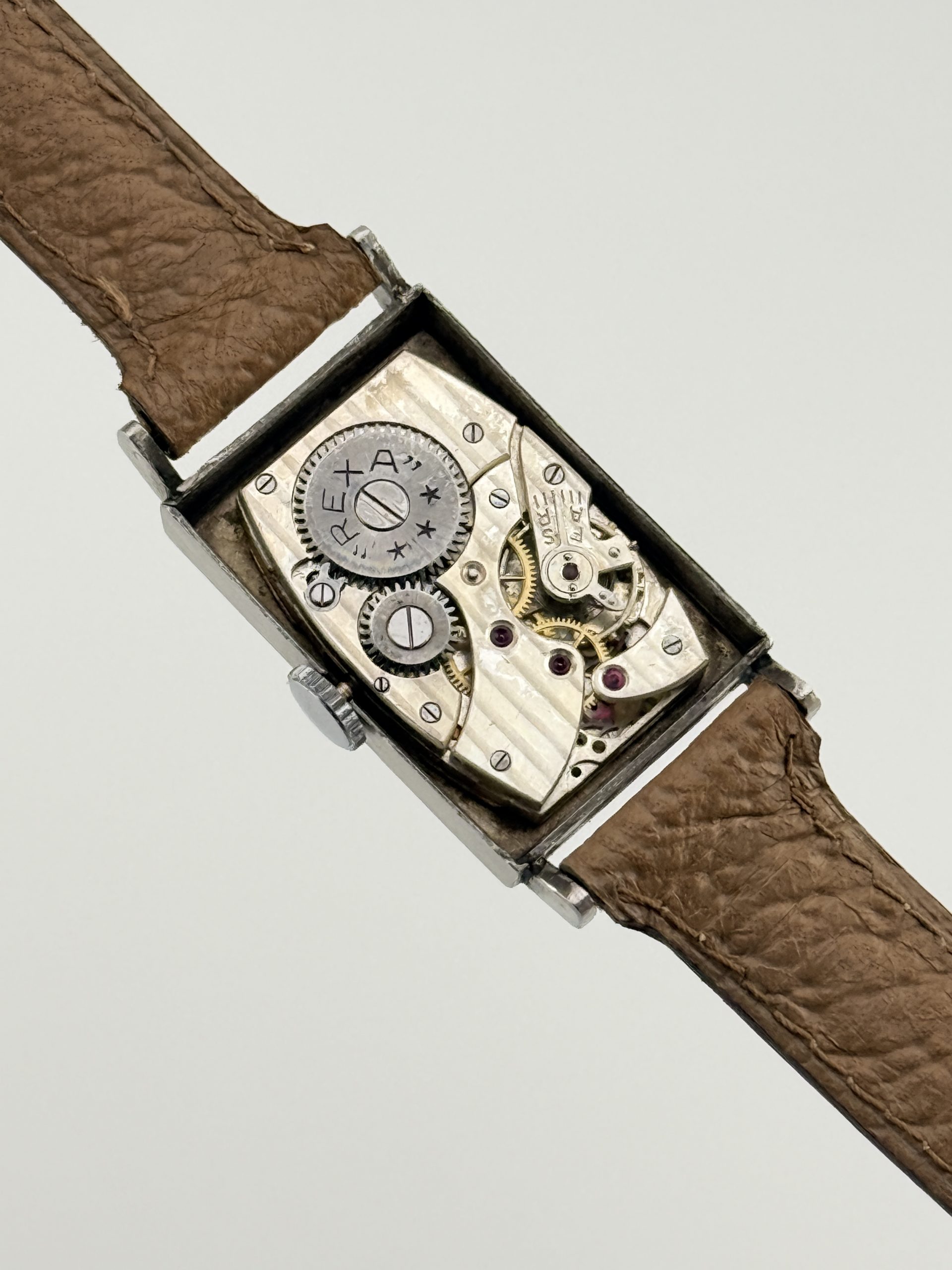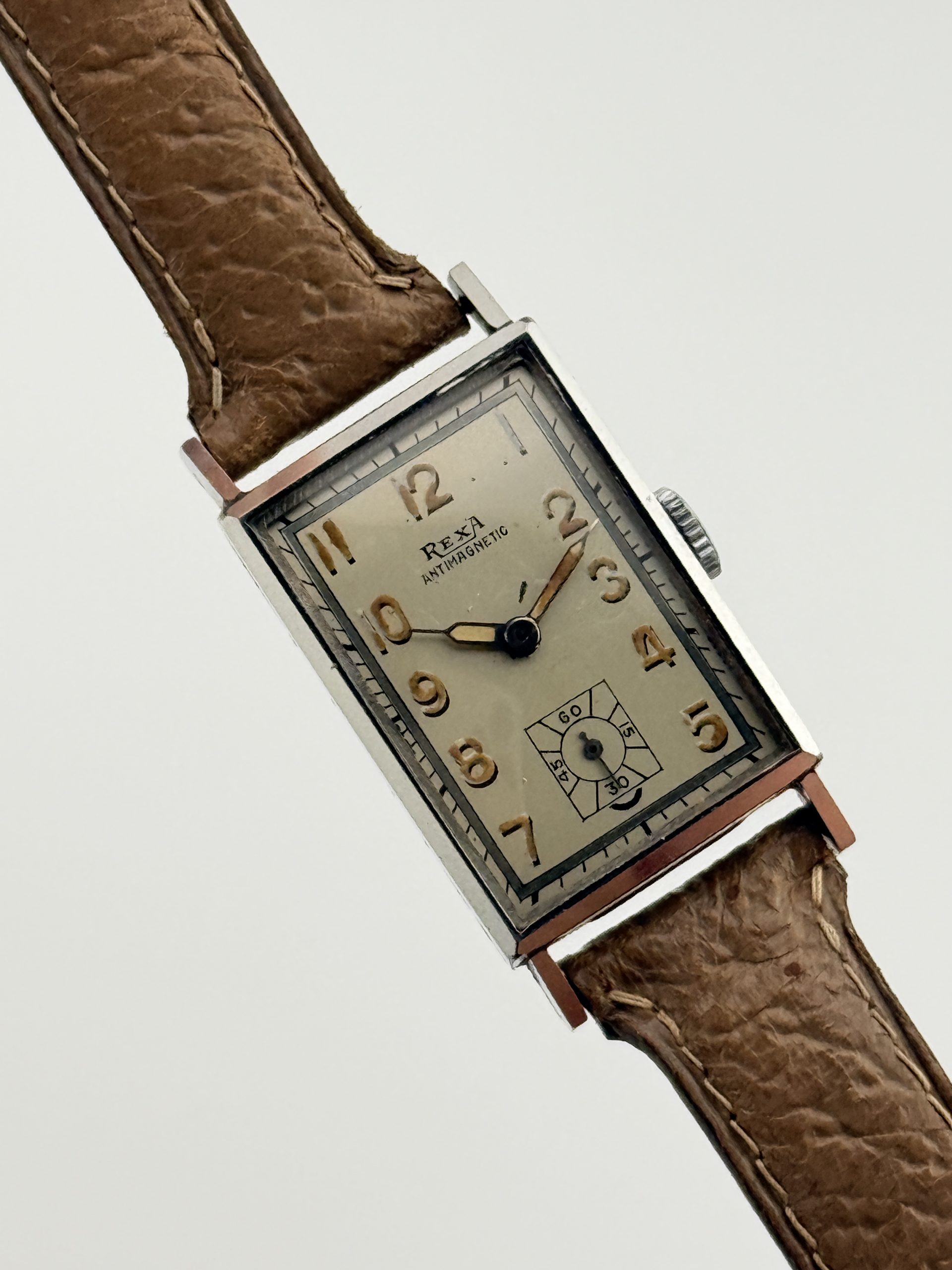 Il Rexa Rectangular ref. 71 è un autentico gioiello dell’orologeria svizzera degli anni ’40, simbolo di eleganza e maestria artigianale. Realizzato con cassa Émile Fiebiger in acciaio, questo segnatempo incarna lo stile geometrico e raffinato dell’Art Déco, con linee pulite e proporzioni perfettamente bilanciate.