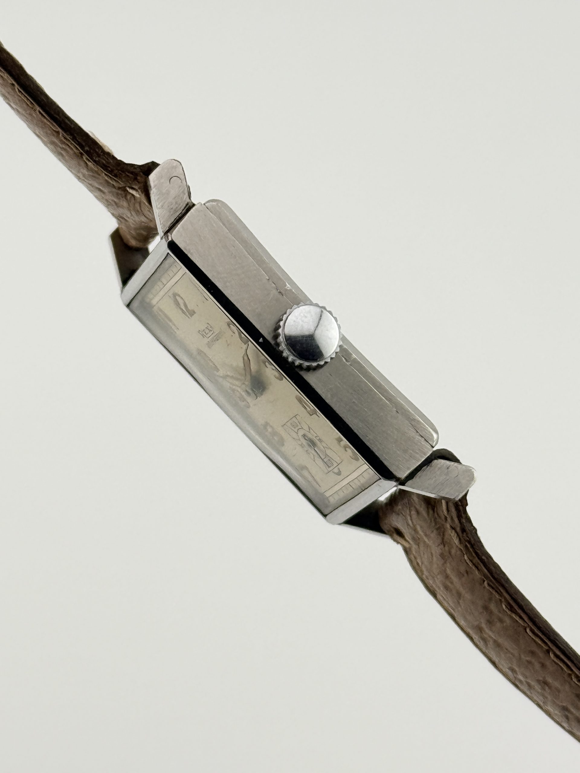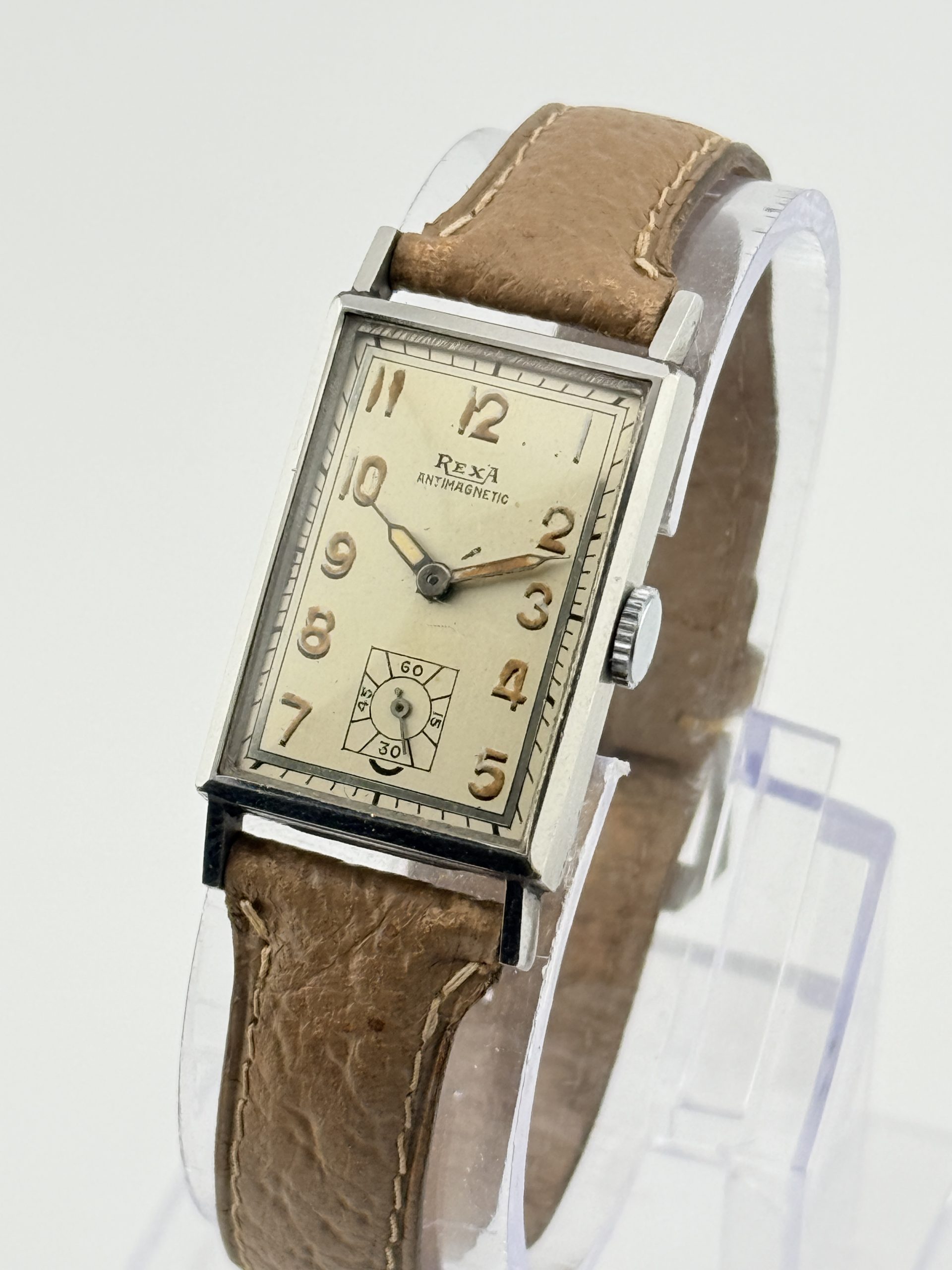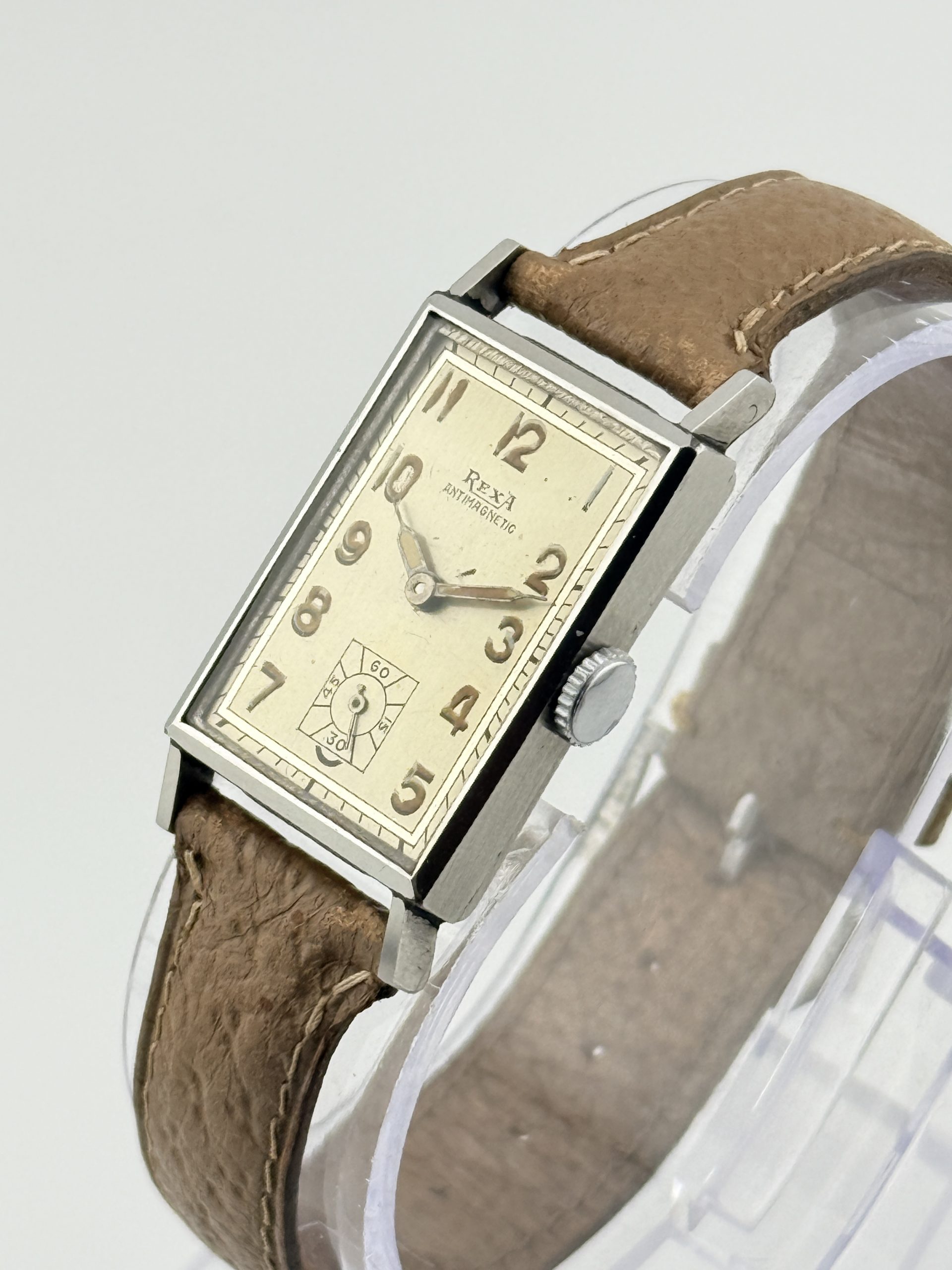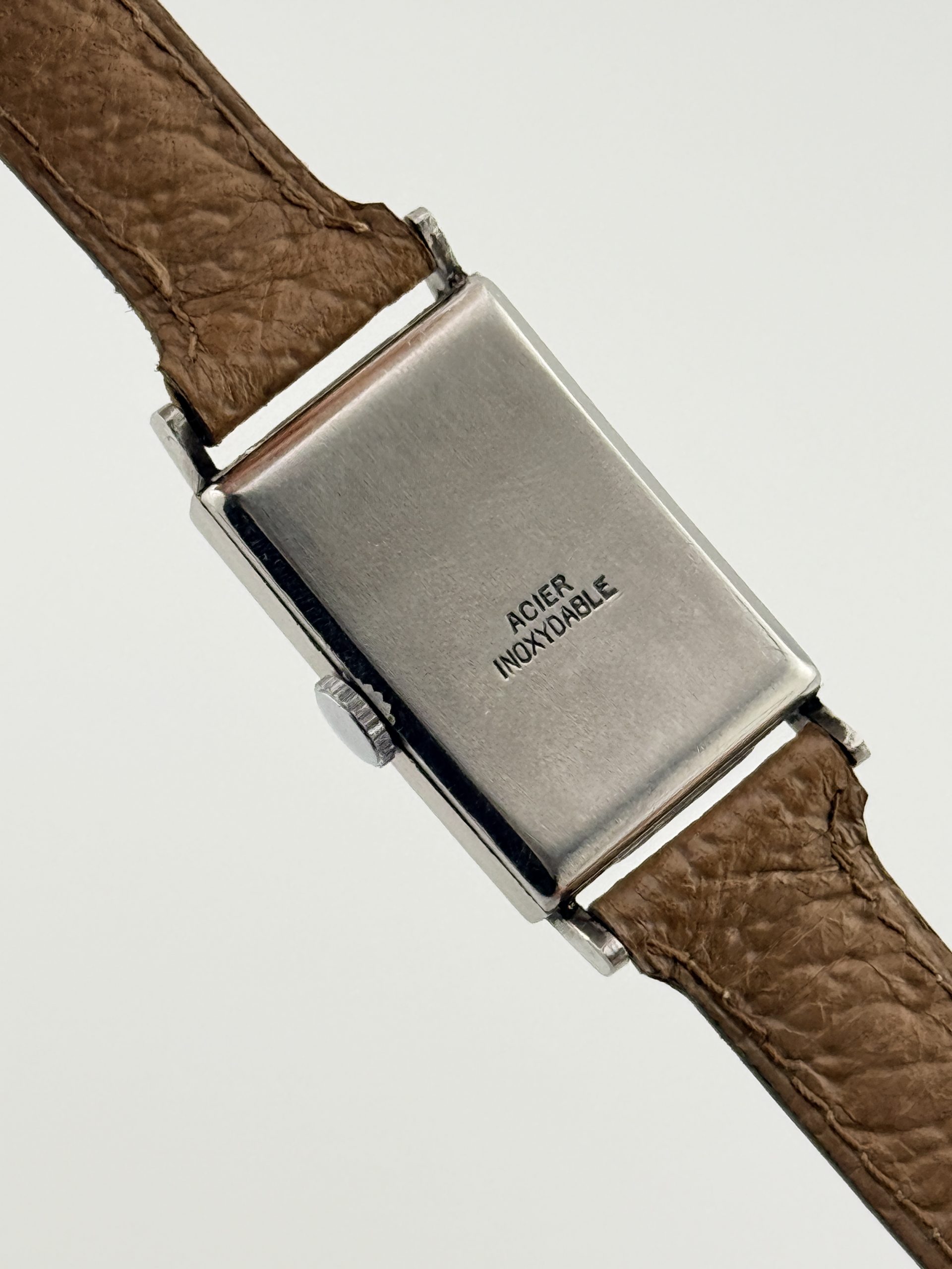 Il Rexa Rectangular ref. 71 è un autentico gioiello dell’orologeria svizzera degli anni ’40, simbolo di eleganza e maestria artigianale. Realizzato con cassa Émile Fiebiger in acciaio, questo segnatempo incarna lo stile geometrico e raffinato dell’Art Déco, con linee pulite e proporzioni perfettamente bilanciate.