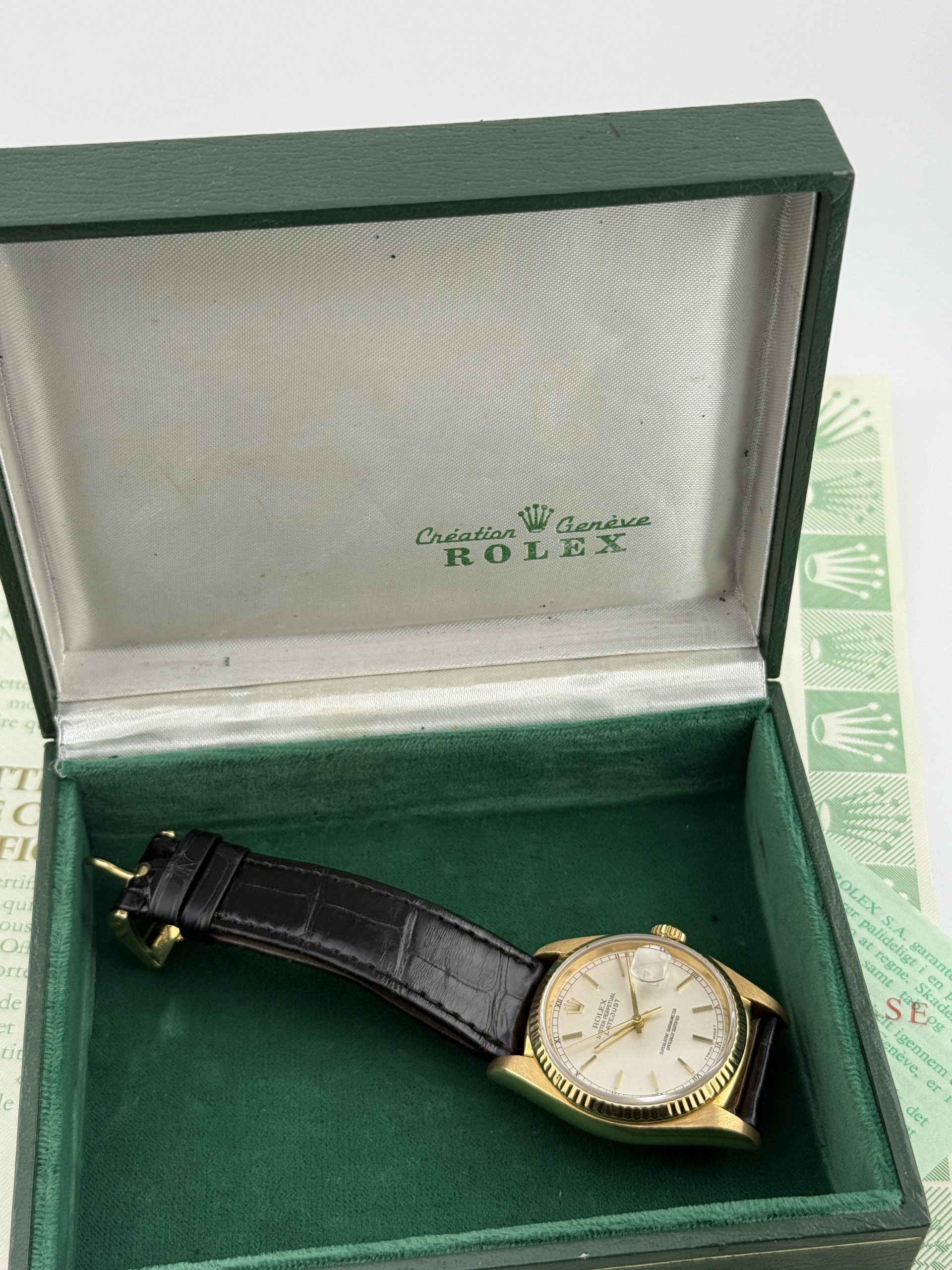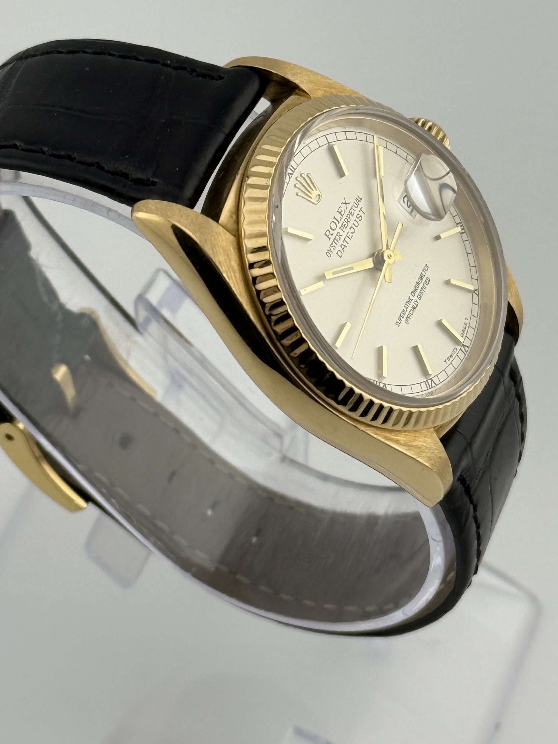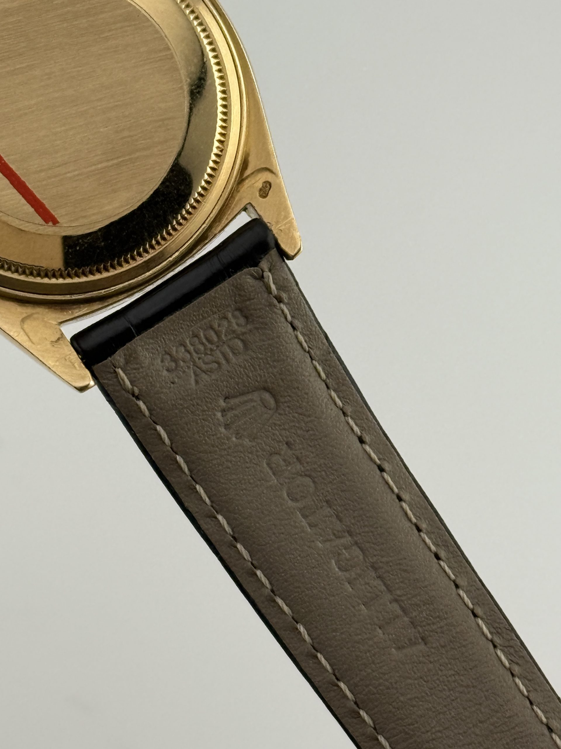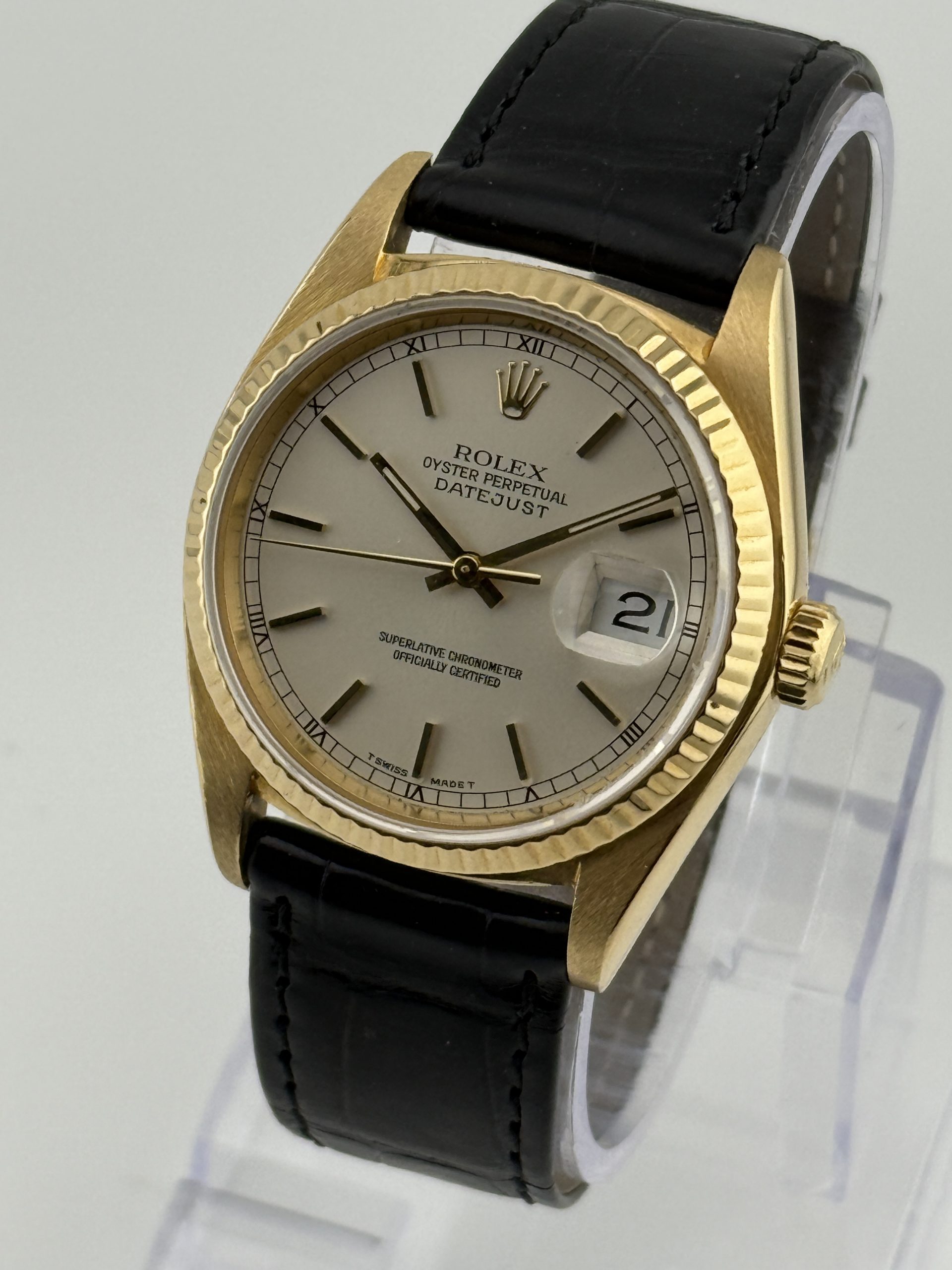 All’interno batte il celebre calibro automatico Rolex 3035, con 27 rubini, riserva di carica di circa 48 ore e frequenza di 28.800 alternanze/ora. Questo movimento rappresenta una pietra miliare nella storia della manifattura, introducendo migliorie tecniche che hanno reso il Datejust ancora più affidabile e preciso. La cassa da 36 mm è impermeabile fino a 10 ATM, mentre il cinturino in pelle nera con chiusura ad ardiglione dona un tocco classico e sobrio, perfetto per accompagnare la brillantezza dell’oro giallo.