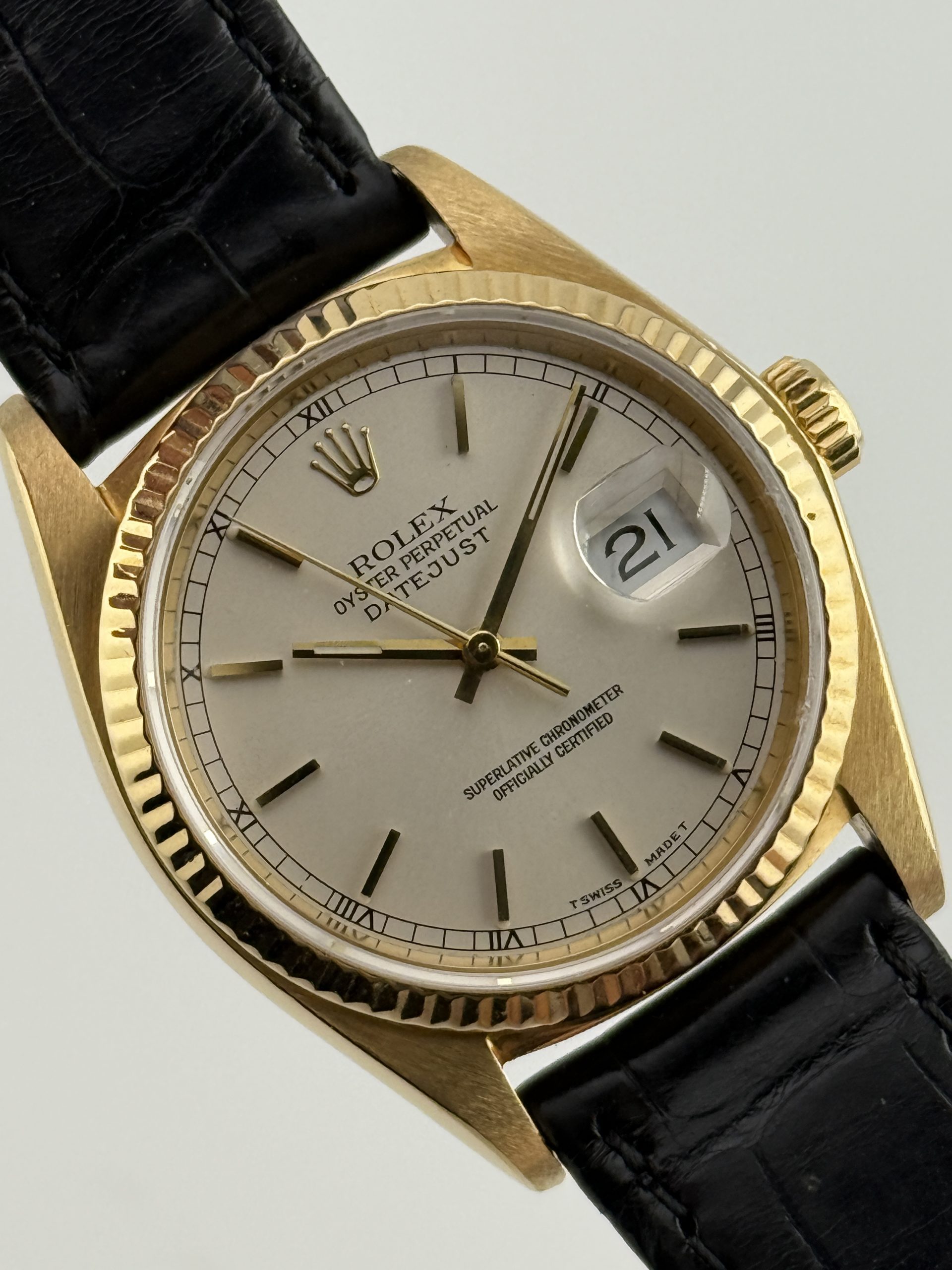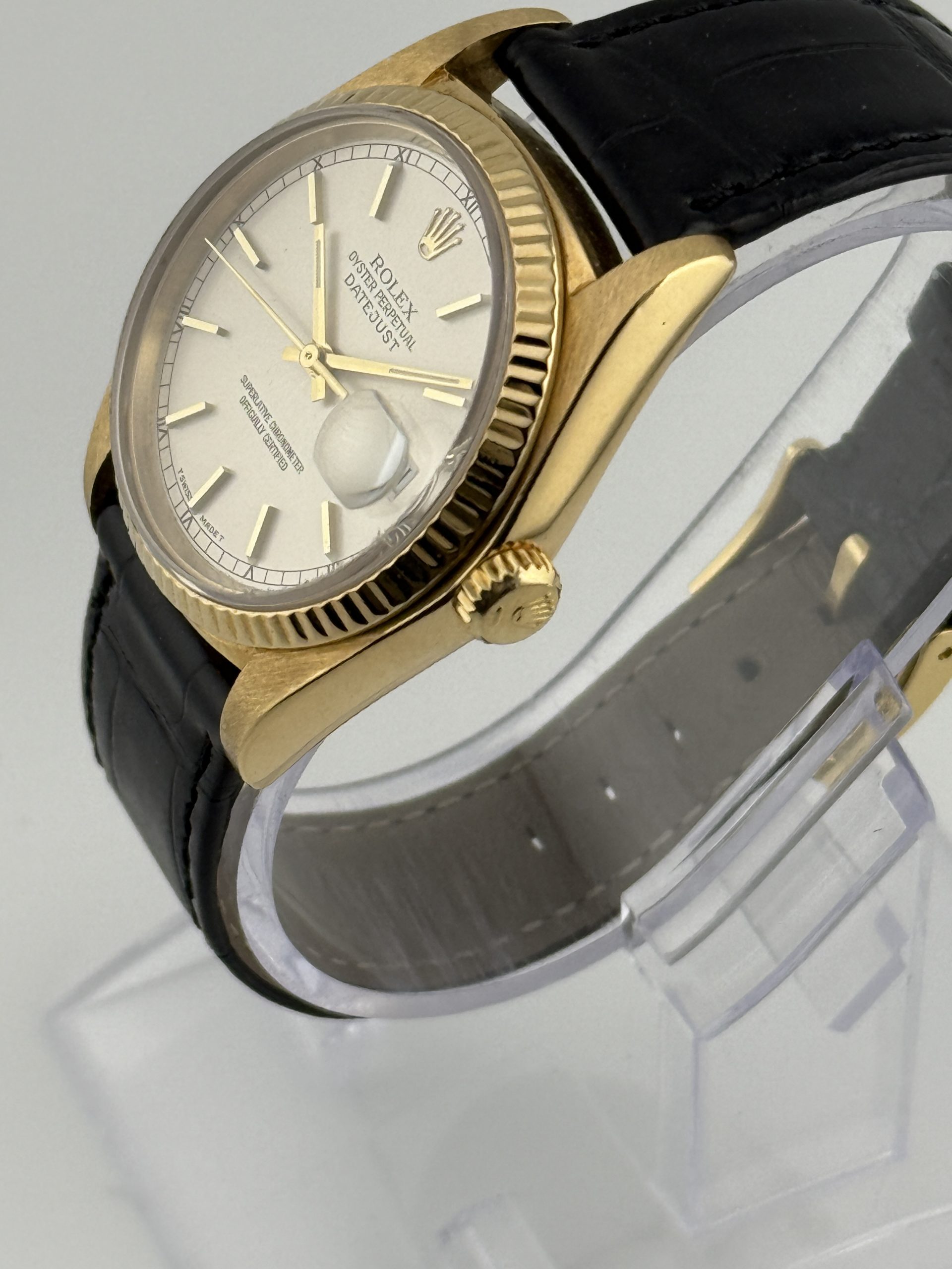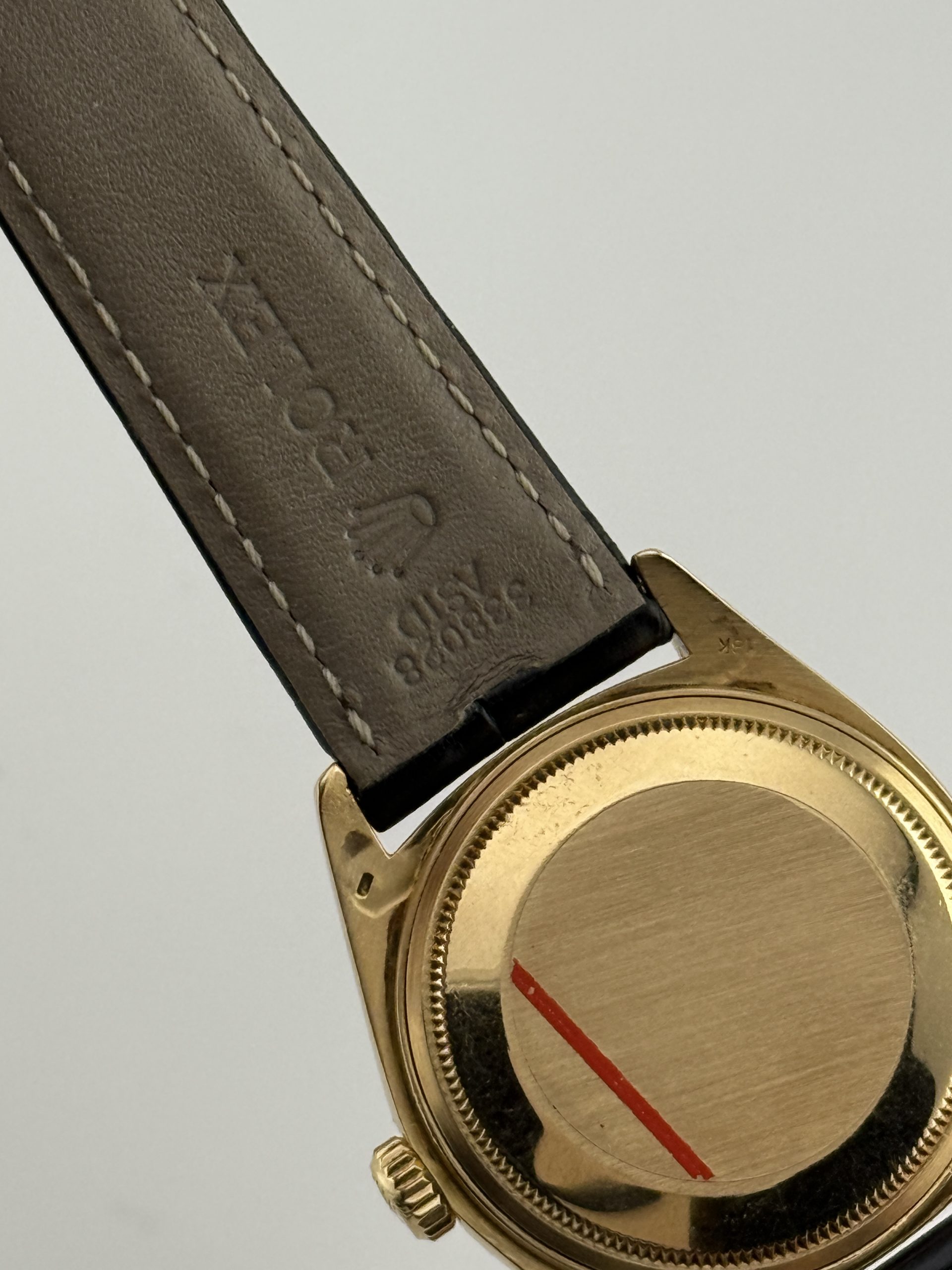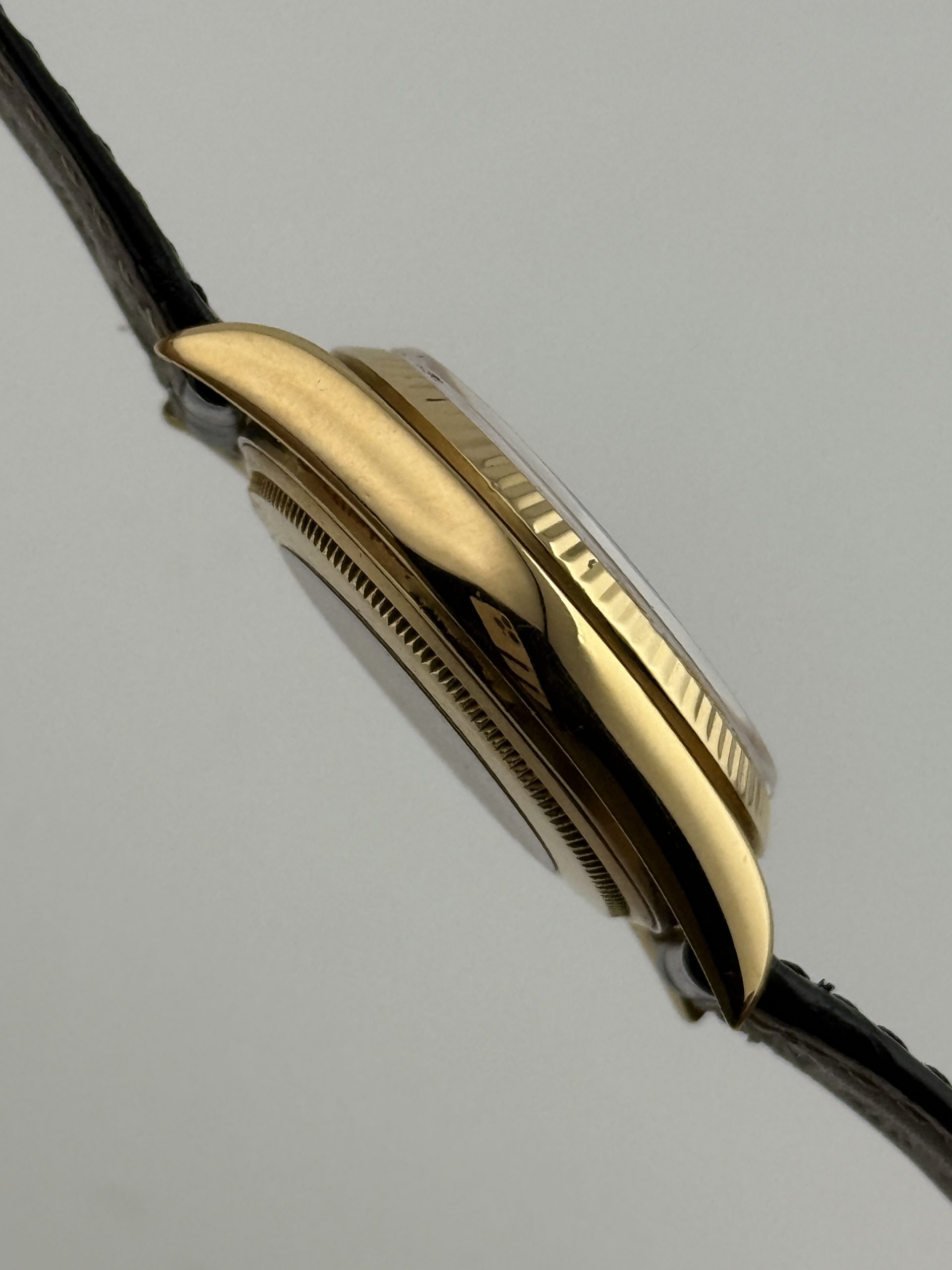 All’interno batte il celebre calibro automatico Rolex 3035, con 27 rubini, riserva di carica di circa 48 ore e frequenza di 28.800 alternanze/ora. Questo movimento rappresenta una pietra miliare nella storia della manifattura, introducendo migliorie tecniche che hanno reso il Datejust ancora più affidabile e preciso. La cassa da 36 mm è impermeabile fino a 10 ATM, mentre il cinturino in pelle nera con chiusura ad ardiglione dona un tocco classico e sobrio, perfetto per accompagnare la brillantezza dell’oro giallo.