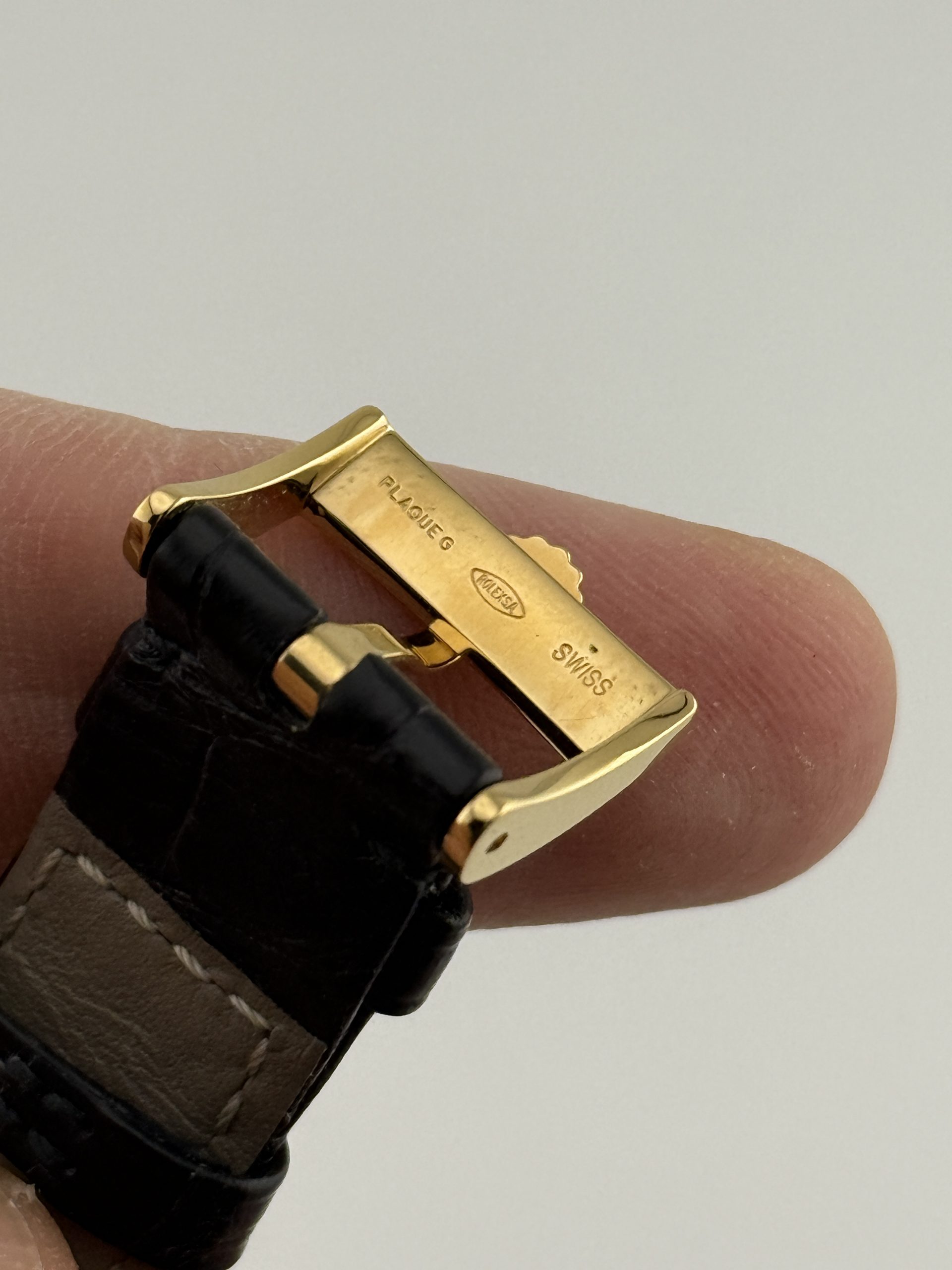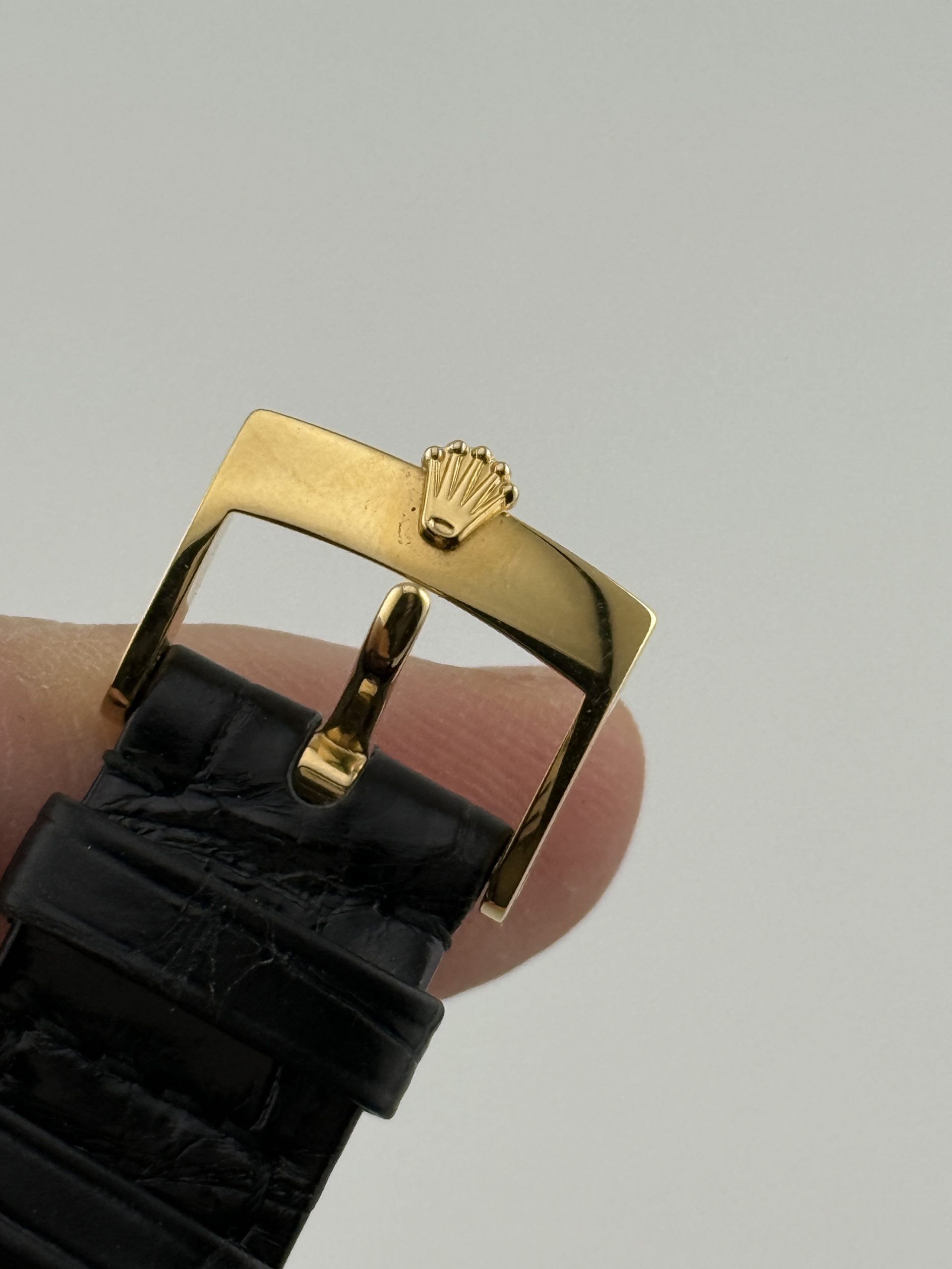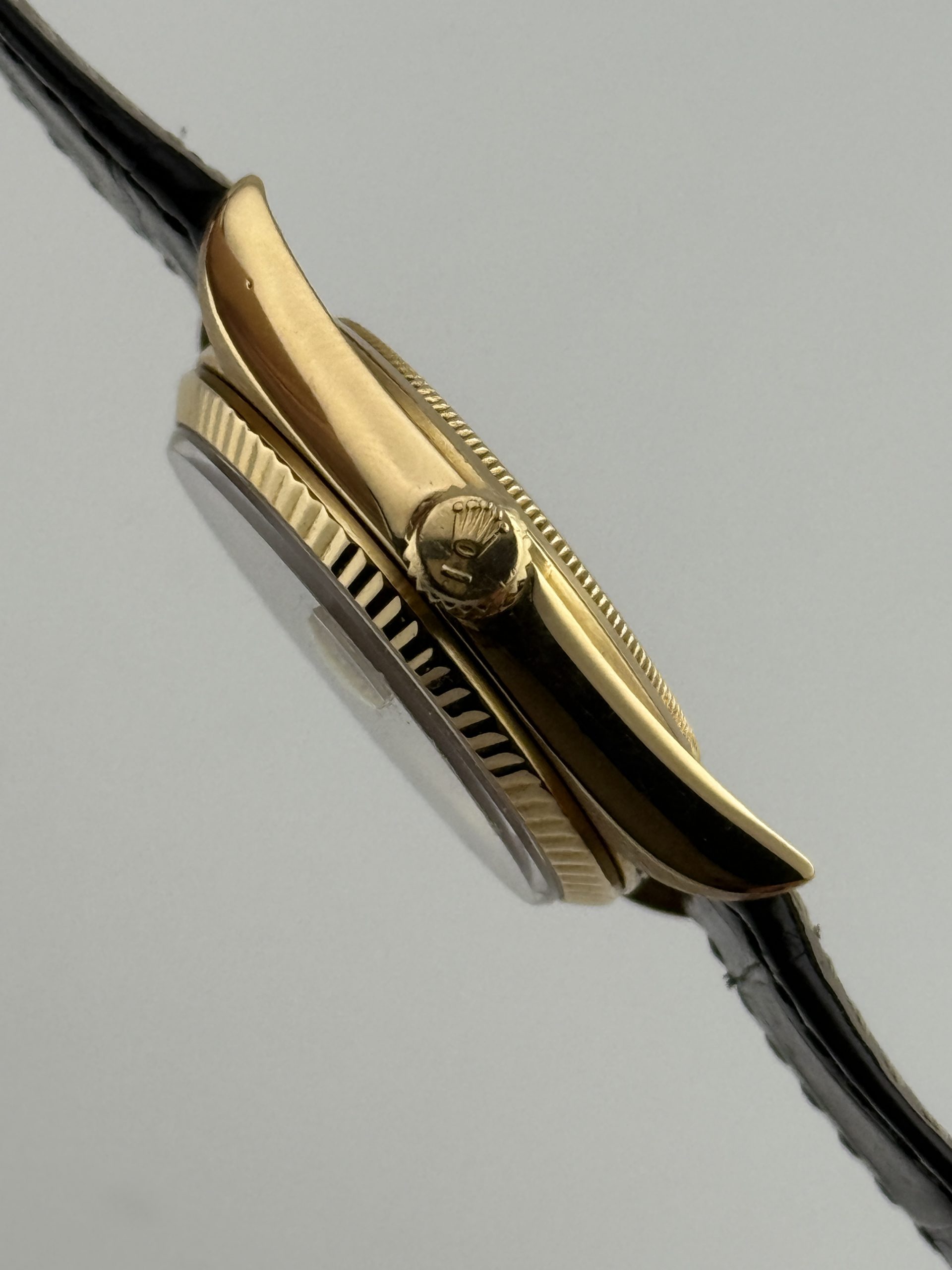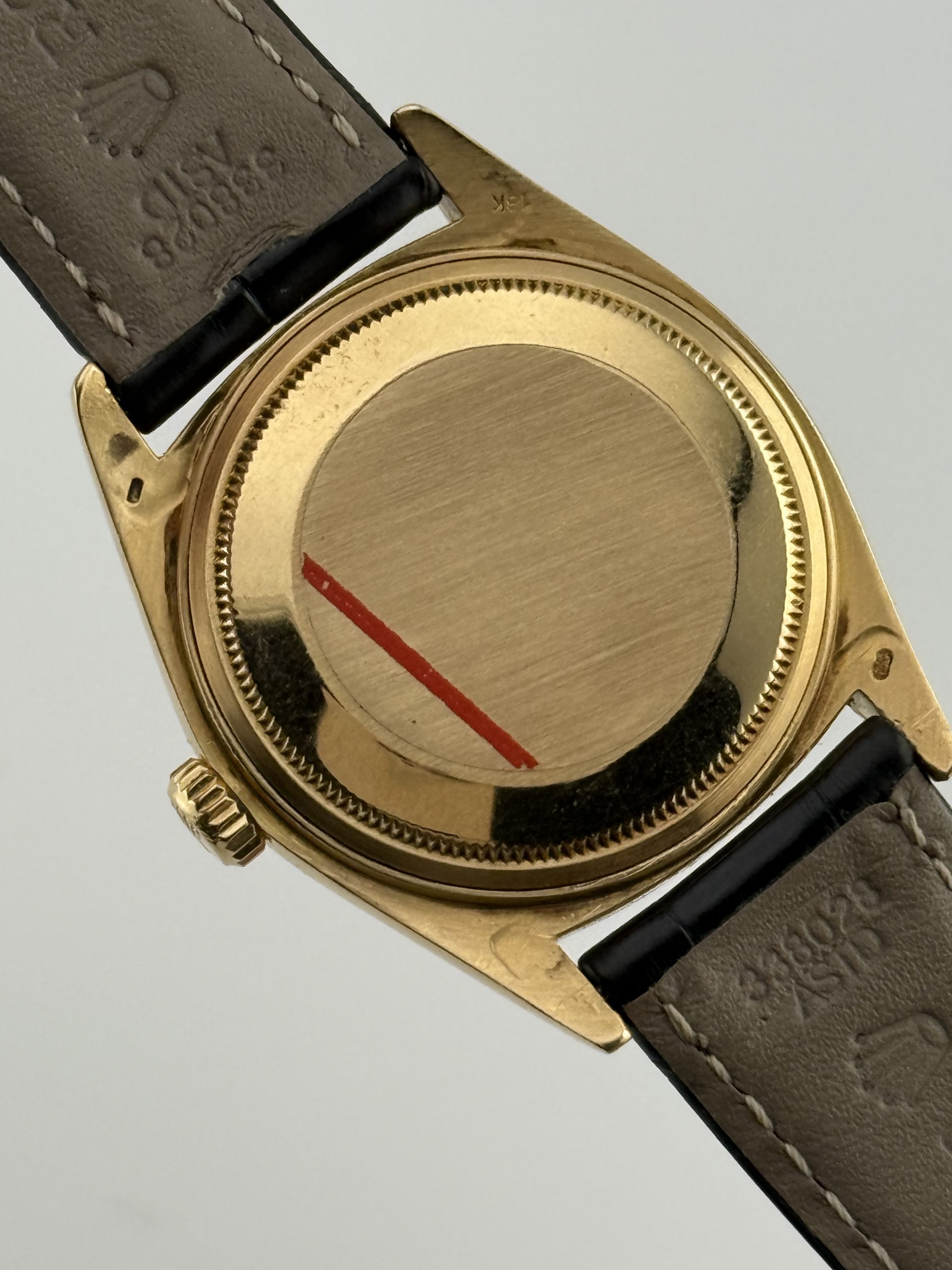 All’interno batte il celebre calibro automatico Rolex 3035, con 27 rubini, riserva di carica di circa 48 ore e frequenza di 28.800 alternanze/ora. Questo movimento rappresenta una pietra miliare nella storia della manifattura, introducendo migliorie tecniche che hanno reso il Datejust ancora più affidabile e preciso. La cassa da 36 mm è impermeabile fino a 10 ATM, mentre il cinturino in pelle nera con chiusura ad ardiglione dona un tocco classico e sobrio, perfetto per accompagnare la brillantezza dell’oro giallo.
