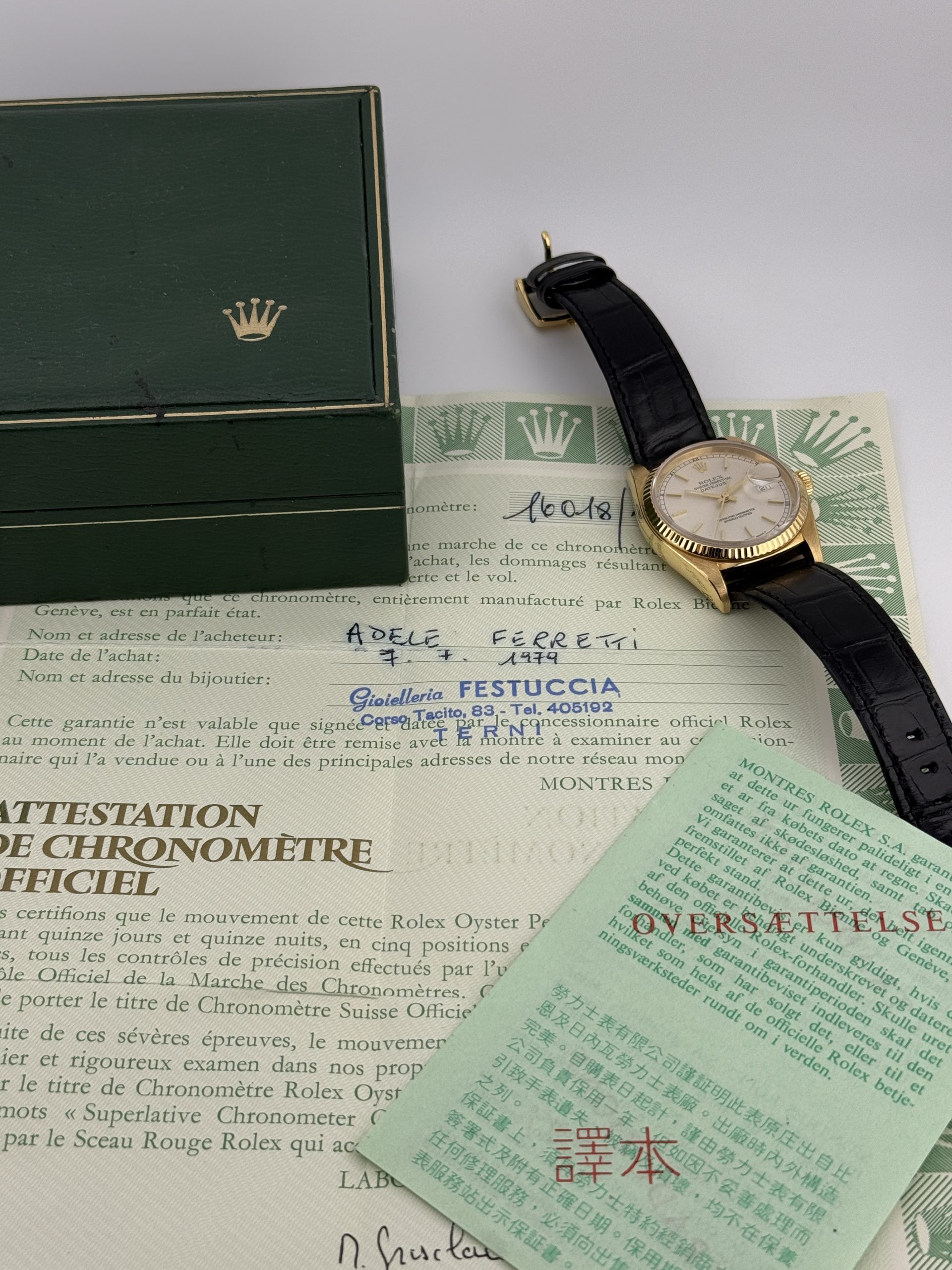 Rolex Datejust 36 ref. 16018, prodotto nel 1979, un’icona senza tempo in una delle configurazioni più raffinate: cassa e lunetta in oro giallo 18kt da 36 mm, abbinata a un elegante quadrante color champagne con datario a ore 3 e vetro zaffiro. Questo esemplare si presenta in ottime condizioni, con soli lievi segni di usura superficiale, ed è accompagnato dal suo corredo completo: scatola originale e documenti originali.