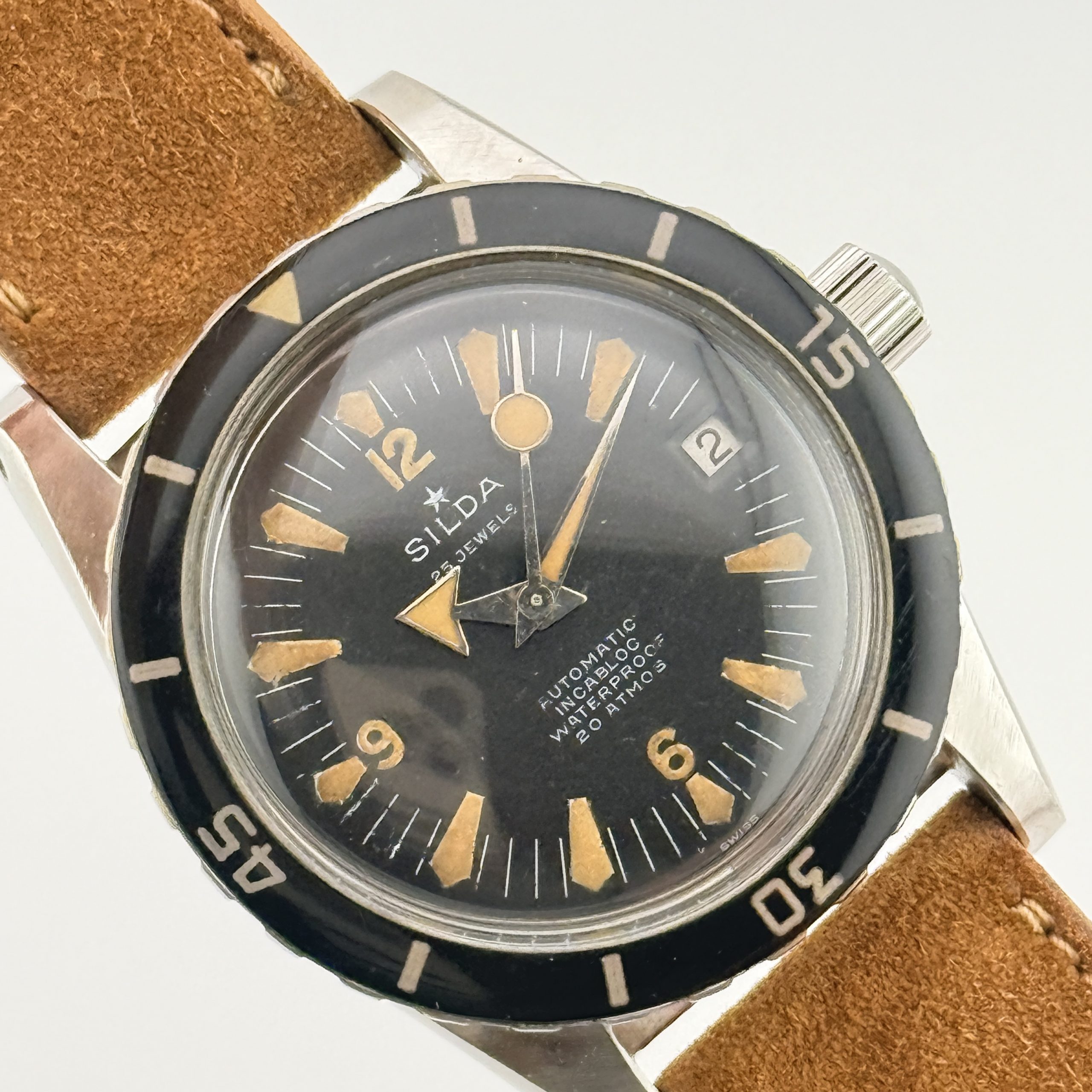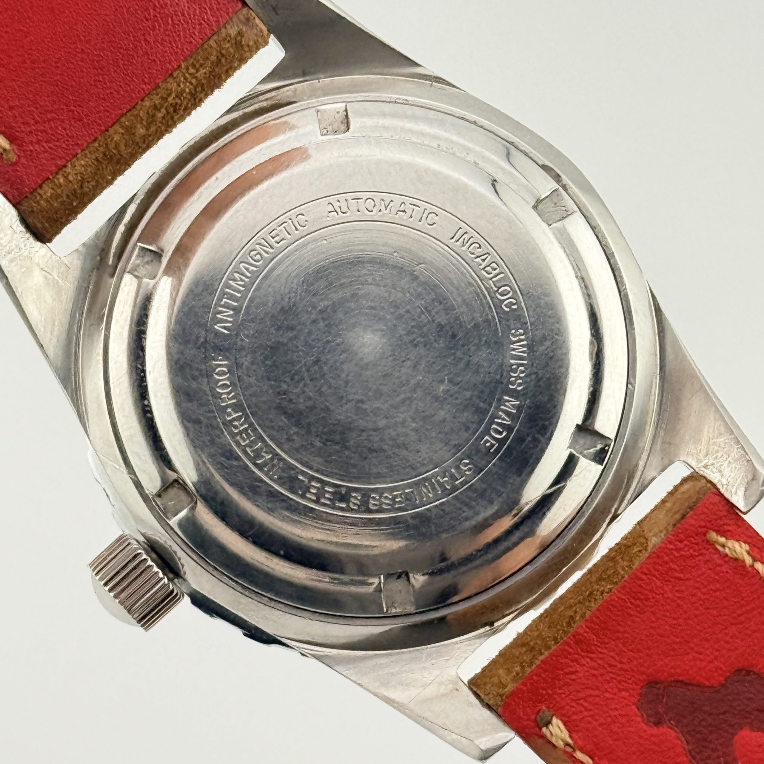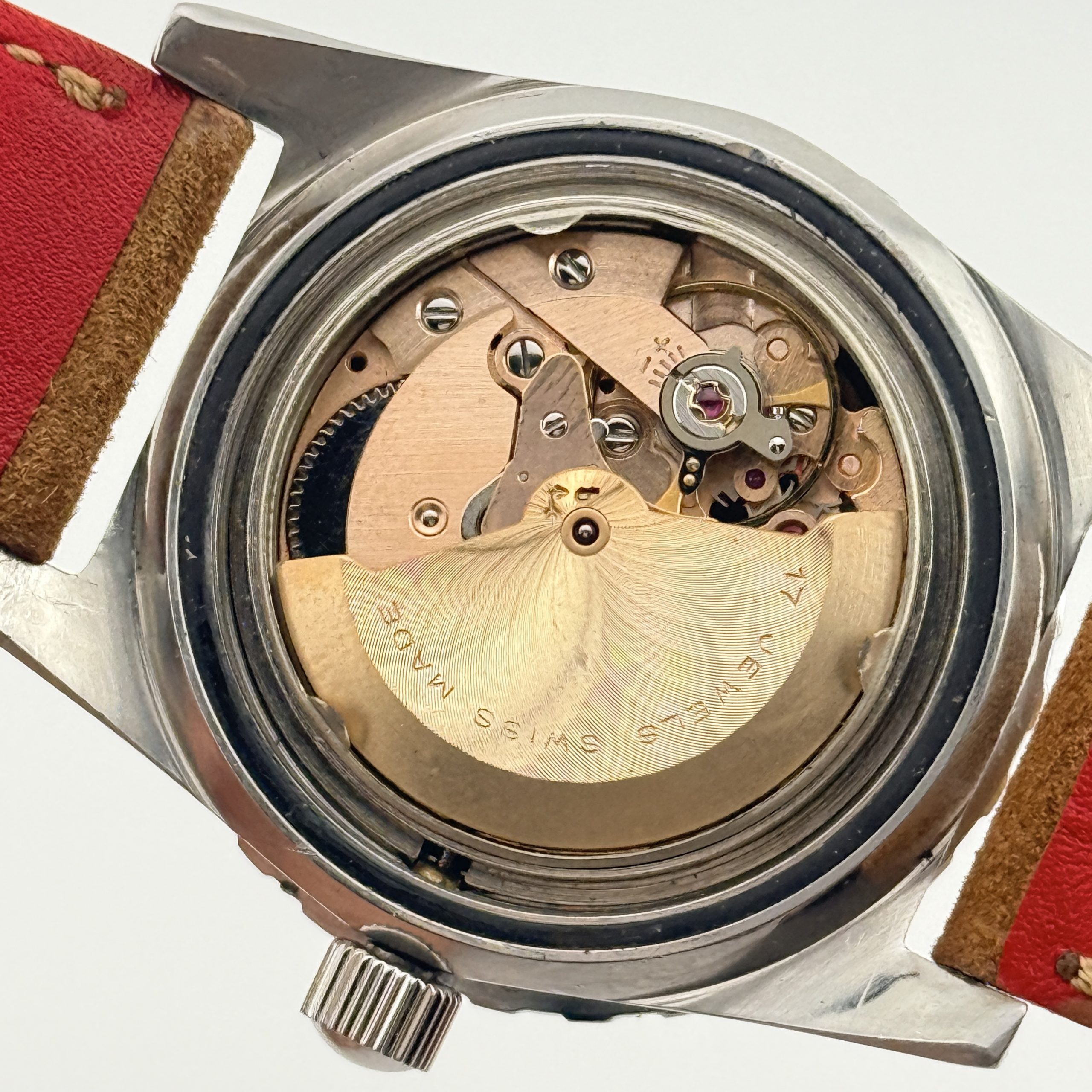 Per il collezionista che cerca un diver fuori dal comune, questo Silda Calypsomatic degli anni โ60 rappresenta una scelta ricca di carattere e autenticitร . La cassa in acciaio da 39 mm, robusta e ben proporzionata, รจ abbinata a una lunetta girevole con inserto in bachelite, dettaglio sempre piรน apprezzato per il suo fascino dโepoca e la sua delicatezza estetica.