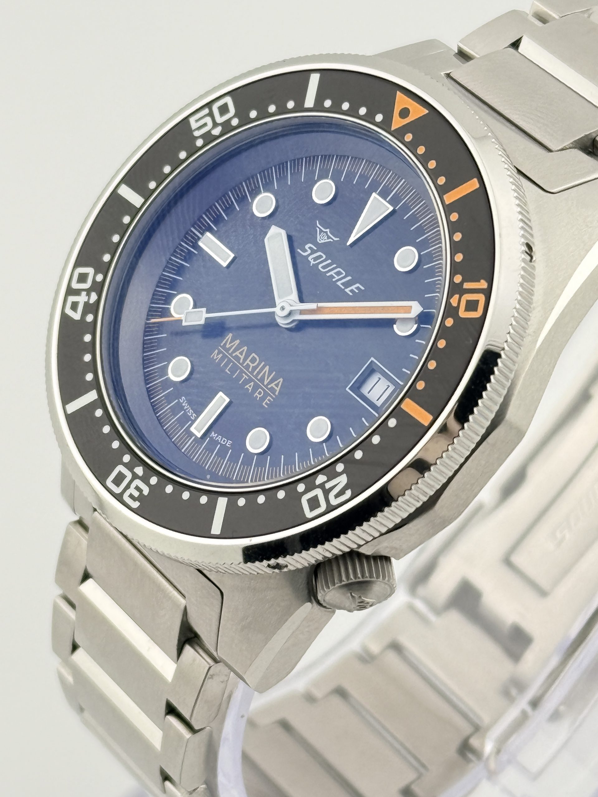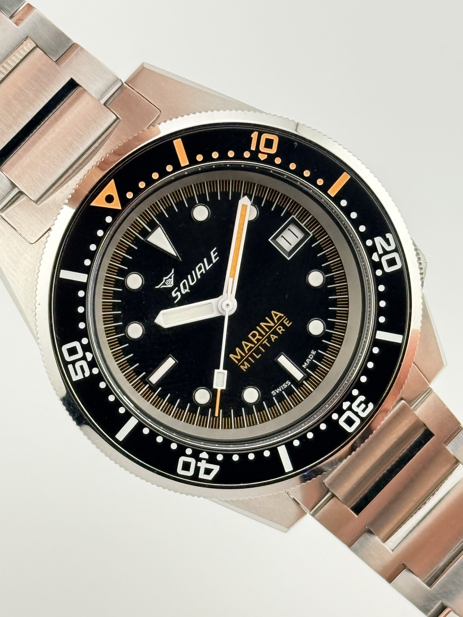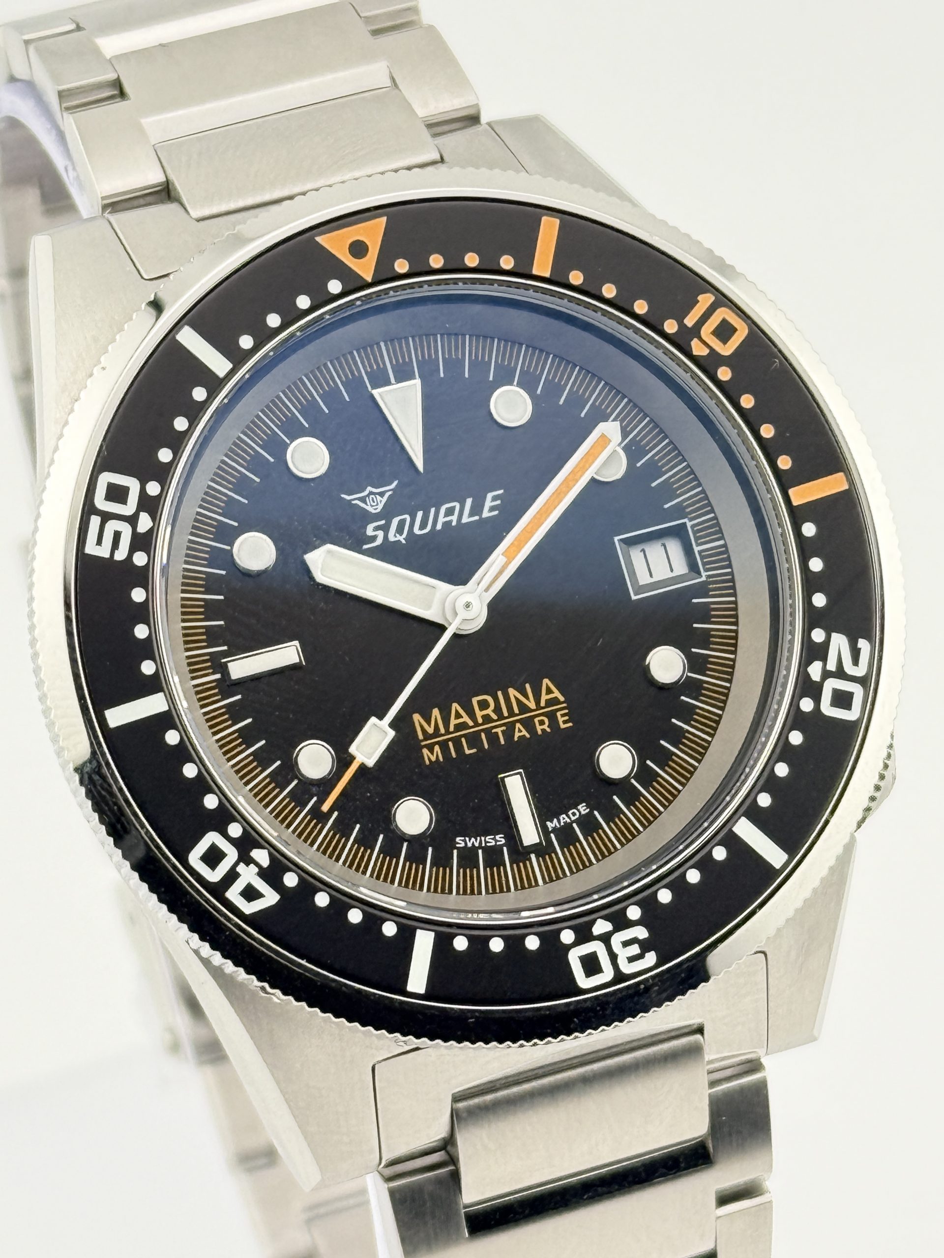 Il quadrante nero opaco è un tributo alla tradizione militare: essenziale, altamente leggibile e impreziosito dalla scritta “MARINA MILITARE” in un elegante giallo-oro che richiama il lume caldo degli indici. La lunetta unidirezionale, anch’essa dal sapore vintage, offre una presa sicura e un feeling di grande qualità. La corona a vite — marchio di fabbrica Squale — assicura una tenuta impeccabile, supportata da un’impermeabilità fino a 50 ATM, perfetta per immersioni impegnative.
