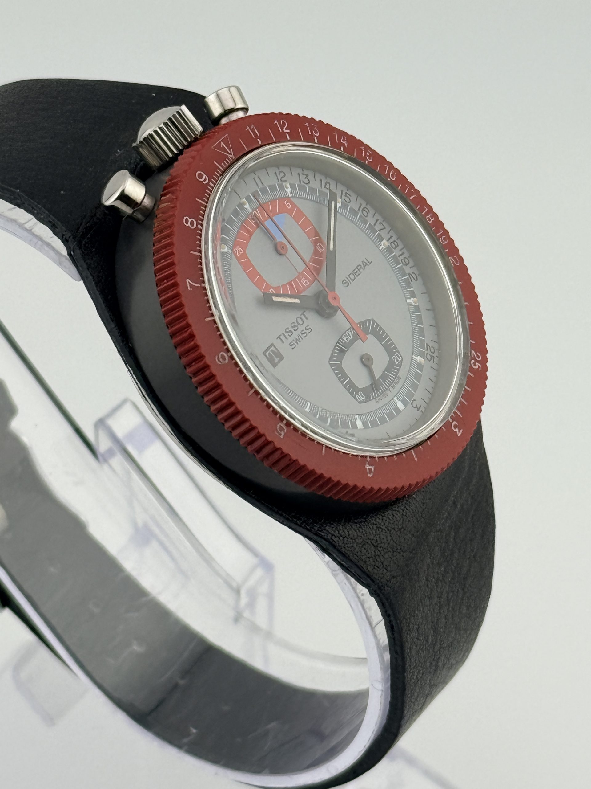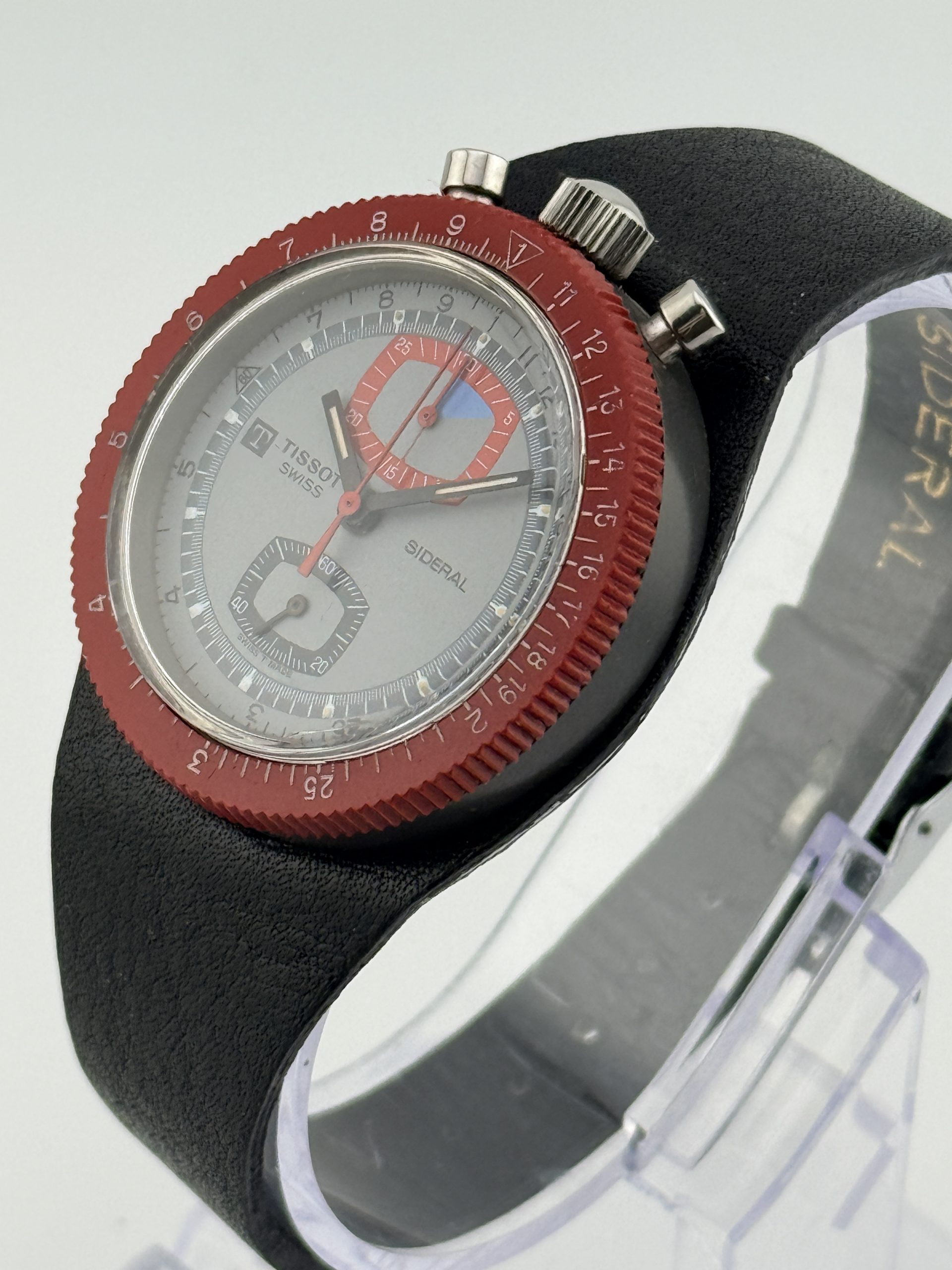 Questo esemplare si presenta in ottime condizioni, con lievi segni del tempo coerenti con lโetร ma non percepibili al tatto. Il cinturino in pelle nera completa il look sportivo e vintage di questo affascinante cronografo Tissot.