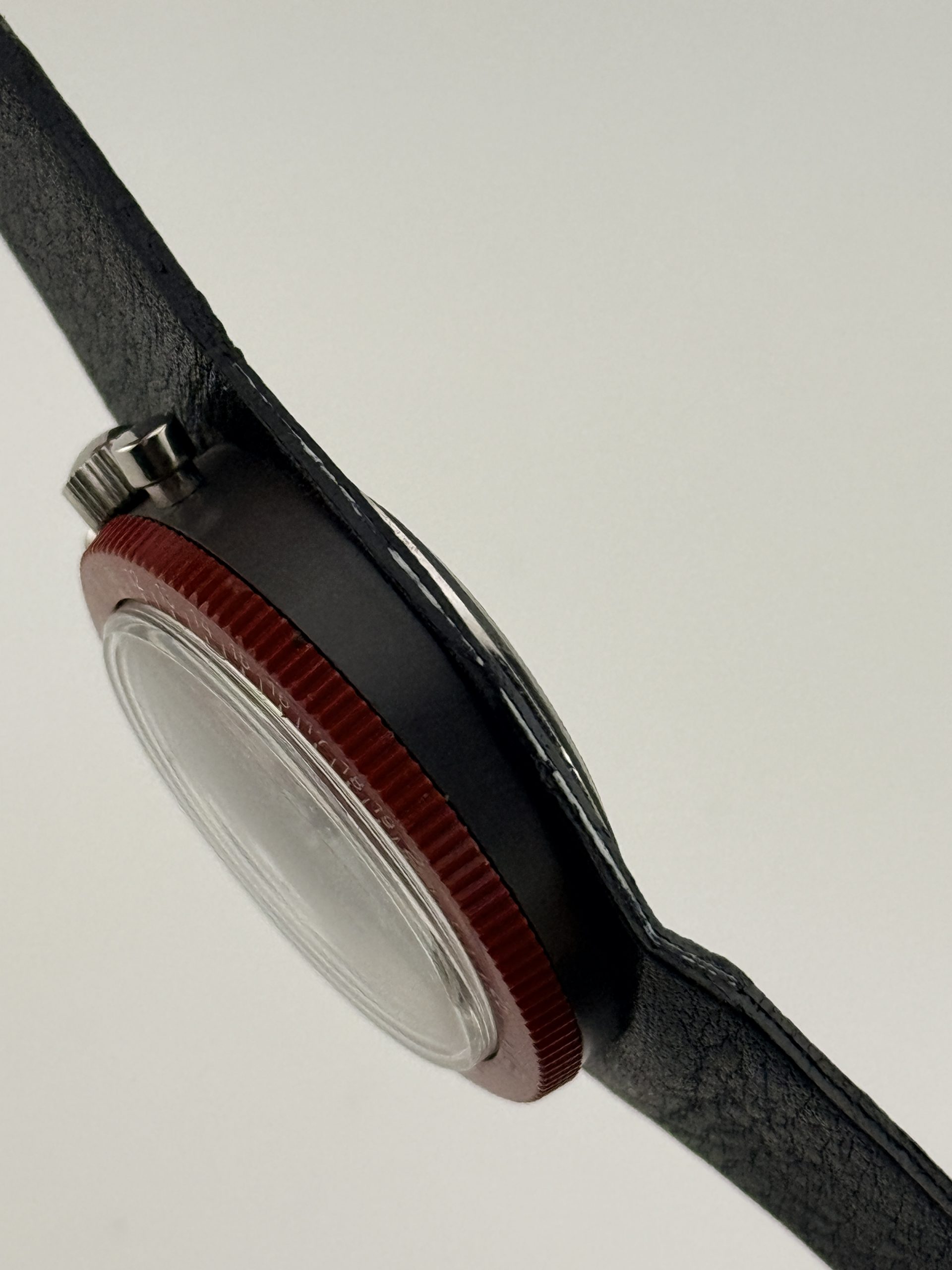 Uno degli elementi piรน affascinanti รจ la lunetta rossa con scala graduata, che crea un forte contrasto con il quadrante grigio multi-scala. Il quadrante presenta una disposizione estremamente tecnica, con indicatori cronografici distintivi e dettagli grafici tipici dellโestetica racing dellโepoca. Le lancette e la lancetta centrale cronografica rossa rafforzano il carattere dinamico e sportivo del modello.